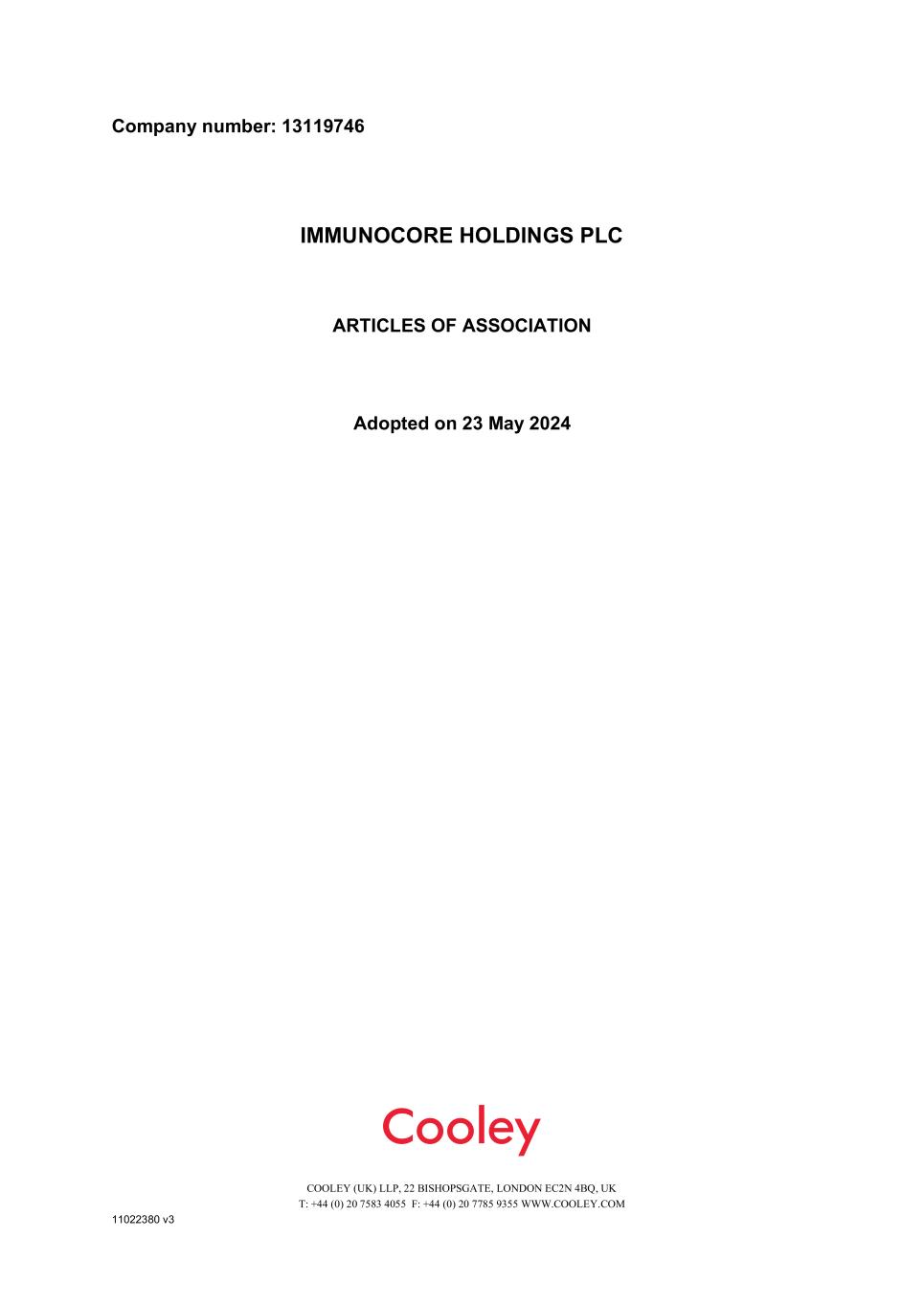 11022380 v3 COOLEY (UK) LLP, 22 BISHOPSGATE, LONDON EC2N 4BQ, UK T: +44 (0) 20 7583 4055 F: +44 (0) 20 7785 9355 WWW.COOLEY.COM Company number: 13119746 IMMUNOCORE HOLDINGS PLC ARTICLES OF ASSOCIATION Adopted on 23 May 2024