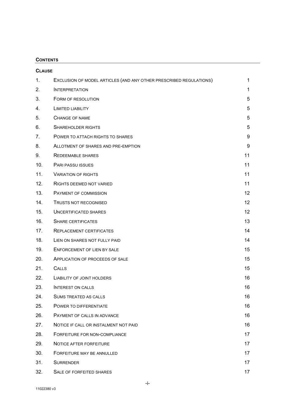 11022380 v3 -i- CONTENTS CLAUSE 1. EXCLUSION OF MODEL ARTICLES (AND ANY OTHER PRESCRIBED REGULATIONS) 1 2. INTERPRETATION 1 3. FORM OF RESOLUTION 5 4. LIMITED LIABILITY 5 5. CHANGE OF NAME 5 6. SHAREHOLDER RIGHTS 5 7. POWER TO ATTACH RIGHTS TO SHARES 9 8. ALLOTMENT OF SHARES AND PRE-EMPTION 9 9. REDEEMABLE SHARES 11 10. PARI PASSU ISSUES 11 11. VARIATION OF RIGHTS 11 12. RIGHTS DEEMED NOT VARIED 11 13. PAYMENT OF COMMISSION 12 14. TRUSTS NOT RECOGNISED 12 15. UNCERTIFICATED SHARES 12 16. SHARE CERTIFICATES 13 17. REPLACEMENT CERTIFICATES 14 18. LIEN ON SHARES NOT FULLY PAID 14 19. ENFORCEMENT OF LIEN BY SALE 15 20. APPLICATION OF PROCEEDS OF SALE 15 21. CALLS 15 22. LIABILITY OF JOINT HOLDERS 16 23. INTEREST ON CALLS 16 24. SUMS TREATED AS CALLS 16 25. POWER TO DIFFERENTIATE 16 26. PAYMENT OF CALLS IN ADVANCE 16 27. NOTICE IF CALL OR INSTALMENT NOT PAID 16 28. FORFEITURE FOR NON-COMPLIANCE 17 29. NOTICE AFTER FORFEITURE 17 30. FORFEITURE MAY BE ANNULLED 17 31. SURRENDER 17 32. SALE OF FORFEITED SHARES 17