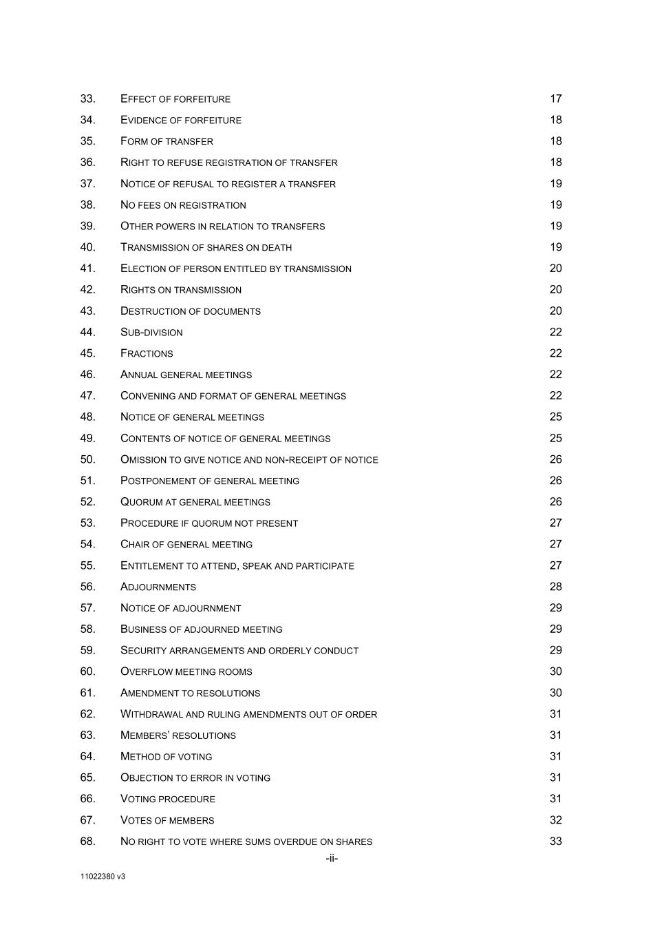 11022380 v3 -ii- 33. EFFECT OF FORFEITURE 17 34. EVIDENCE OF FORFEITURE 18 35. FORM OF TRANSFER 18 36. RIGHT TO REFUSE REGISTRATION OF TRANSFER 18 37. NOTICE OF REFUSAL TO REGISTER A TRANSFER 19 38. NO FEES ON REGISTRATION 19 39. OTHER POWERS IN RELATION TO TRANSFERS 19 40. TRANSMISSION OF SHARES ON DEATH 19 41. ELECTION OF PERSON ENTITLED BY TRANSMISSION 20 42. RIGHTS ON TRANSMISSION 20 43. DESTRUCTION OF DOCUMENTS 20 44. SUB-DIVISION 22 45. FRACTIONS 22 46. ANNUAL GENERAL MEETINGS 22 47. CONVENING AND FORMAT OF GENERAL MEETINGS 22 48. NOTICE OF GENERAL MEETINGS 25 49. CONTENTS OF NOTICE OF GENERAL MEETINGS 25 50. OMISSION TO GIVE NOTICE AND NON-RECEIPT OF NOTICE 26 51. POSTPONEMENT OF GENERAL MEETING 26 52. QUORUM AT GENERAL MEETINGS 26 53. PROCEDURE IF QUORUM NOT PRESENT 27 54. CHAIR OF GENERAL MEETING 27 55. ENTITLEMENT TO ATTEND, SPEAK AND PARTICIPATE 27 56. ADJOURNMENTS 28 57. NOTICE OF ADJOURNMENT 29 58. BUSINESS OF ADJOURNED MEETING 29 59. SECURITY ARRANGEMENTS AND ORDERLY CONDUCT 29 60. OVERFLOW MEETING ROOMS 30 61. AMENDMENT TO RESOLUTIONS 30 62. WITHDRAWAL AND RULING AMENDMENTS OUT OF ORDER 31 63. MEMBERS’ RESOLUTIONS 31 64. METHOD OF VOTING 31 65. OBJECTION TO ERROR IN VOTING 31 66. VOTING PROCEDURE 31 67. VOTES OF MEMBERS 32 68. NO RIGHT TO VOTE WHERE SUMS OVERDUE ON SHARES 33