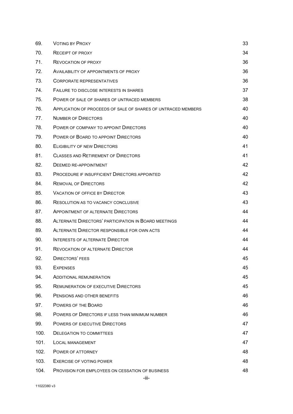 11022380 v3 -iii- 69. VOTING BY PROXY 33 70. RECEIPT OF PROXY 34 71. REVOCATION OF PROXY 36 72. AVAILABILITY OF APPOINTMENTS OF PROXY 36 73. CORPORATE REPRESENTATIVES 36 74. FAILURE TO DISCLOSE INTERESTS IN SHARES 37 75. POWER OF SALE OF SHARES OF UNTRACED MEMBERS 38 76. APPLICATION OF PROCEEDS OF SALE OF SHARES OF UNTRACED MEMBERS 40 77. NUMBER OF DIRECTORS 40 78. POWER OF COMPANY TO APPOINT DIRECTORS 40 79. POWER OF BOARD TO APPOINT DIRECTORS 40 80. ELIGIBILITY OF NEW DIRECTORS 41 81. CLASSES AND RETIREMENT OF DIRECTORS 41 82. DEEMED RE-APPOINTMENT 42 83. PROCEDURE IF INSUFFICIENT DIRECTORS APPOINTED 42 84. REMOVAL OF DIRECTORS 42 85. VACATION OF OFFICE BY DIRECTOR 43 86. RESOLUTION AS TO VACANCY CONCLUSIVE 43 87. APPOINTMENT OF ALTERNATE DIRECTORS 44 88. ALTERNATE DIRECTORS’ PARTICIPATION IN BOARD MEETINGS 44 89. ALTERNATE DIRECTOR RESPONSIBLE FOR OWN ACTS 44 90. INTERESTS OF ALTERNATE DIRECTOR 44 91. REVOCATION OF ALTERNATE DIRECTOR 44 92. DIRECTORS’ FEES 45 93. EXPENSES 45 94. ADDITIONAL REMUNERATION 45 95. REMUNERATION OF EXECUTIVE DIRECTORS 45 96. PENSIONS AND OTHER BENEFITS 46 97. POWERS OF THE BOARD 46 98. POWERS OF DIRECTORS IF LESS THAN MINIMUM NUMBER 46 99. POWERS OF EXECUTIVE DIRECTORS 47 100. DELEGATION TO COMMITTEES 47 101. LOCAL MANAGEMENT 47 102. POWER OF ATTORNEY 48 103. EXERCISE OF VOTING POWER 48 104. PROVISION FOR EMPLOYEES ON CESSATION OF BUSINESS 48