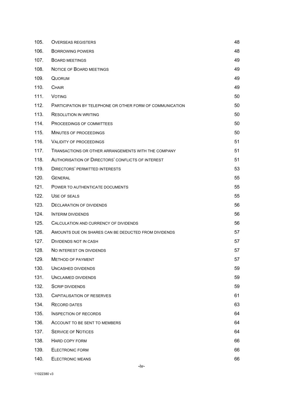 11022380 v3 -iv- 105. OVERSEAS REGISTERS 48 106. BORROWING POWERS 48 107. BOARD MEETINGS 49 108. NOTICE OF BOARD MEETINGS 49 109. QUORUM 49 110. CHAIR 49 111. VOTING 50 112. PARTICIPATION BY TELEPHONE OR OTHER FORM OF COMMUNICATION 50 113. RESOLUTION IN WRITING 50 114. PROCEEDINGS OF COMMITTEES 50 115. MINUTES OF PROCEEDINGS 50 116. VALIDITY OF PROCEEDINGS 51 117. TRANSACTIONS OR OTHER ARRANGEMENTS WITH THE COMPANY 51 118. AUTHORISATION OF DIRECTORS’ CONFLICTS OF INTEREST 51 119. DIRECTORS’ PERMITTED INTERESTS 53 120. GENERAL 55 121. POWER TO AUTHENTICATE DOCUMENTS 55 122. USE OF SEALS 55 123. DECLARATION OF DIVIDENDS 56 124. INTERIM DIVIDENDS 56 125. CALCULATION AND CURRENCY OF DIVIDENDS 56 126. AMOUNTS DUE ON SHARES CAN BE DEDUCTED FROM DIVIDENDS 57 127. DIVIDENDS NOT IN CASH 57 128. NO INTEREST ON DIVIDENDS 57 129. METHOD OF PAYMENT 57 130. UNCASHED DIVIDENDS 59 131. UNCLAIMED DIVIDENDS 59 132. SCRIP DIVIDENDS 59 133. CAPITALISATION OF RESERVES 61 134. RECORD DATES 63 135. INSPECTION OF RECORDS 64 136. ACCOUNT TO BE SENT TO MEMBERS 64 137. SERVICE OF NOTICES 64 138. HARD COPY FORM 66 139. ELECTRONIC FORM 66 140. ELECTRONIC MEANS 66