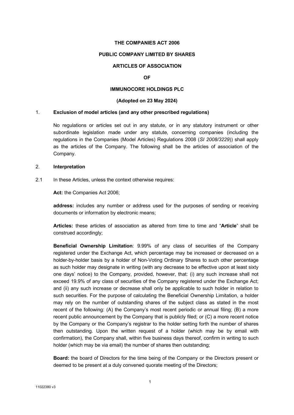 11022380 v3 1 THE COMPANIES ACT 2006 PUBLIC COMPANY LIMITED BY SHARES ARTICLES OF ASSOCIATION OF IMMUNOCORE HOLDINGS PLC (Adopted on 23 May 2024) 1. Exclusion of model articles (and any other prescribed regulations) No regulations or articles set out in any statute, or in any statutory instrument or other subordinate legislation made under any statute, concerning companies (including the regulations in the Companies (Model Articles) Regulations 2008 (SI 2008/3229)) shall apply as the articles of the Company. The following shall be the articles of association of the Company. 2. Interpretation 2.1 In these Articles, unless the context otherwise requires: Act: the Companies Act 2006; address: includes any number or address used for the purposes of sending or receiving documents or information by electronic means; Articles: these articles of association as altered from time to time and “Article” shall be construed accordingly; Beneficial Ownership Limitation: 9.99% of any class of securities of the Company registered under the Exchange Act, which percentage may be increased or decreased on a holder-by-holder basis by a holder of Non-Voting Ordinary Shares to such other percentage as such holder may designate in writing (with any decrease to be effective upon at least sixty one days’ notice) to the Company, provided, however, that: (i) any such increase shall not exceed 19.9% of any class of securities of the Company registered under the Exchange Act; and (ii) any such increase or decrease shall only be applicable to such holder in relation to such securities. For the purpose of calculating the Beneficial Ownership Limitation, a holder may rely on the number of outstanding shares of the subject class as stated in the most recent of the following: (A) the Company’s most recent periodic or annual filing; (B) a more recent public announcement by the Company that is publicly filed; or (C) a more recent notice by the Company or the Company’s registrar to the holder setting forth the number of shares then outstanding. Upon the written request of a holder (which may be by email with confirmation), the Company shall, within five business days thereof, confirm in writing to such holder (which may be via email) the number of shares then outstanding; Board: the board of Directors for the time being of the Company or the Directors present or deemed to be present at a duly convened quorate meeting of the Directors;