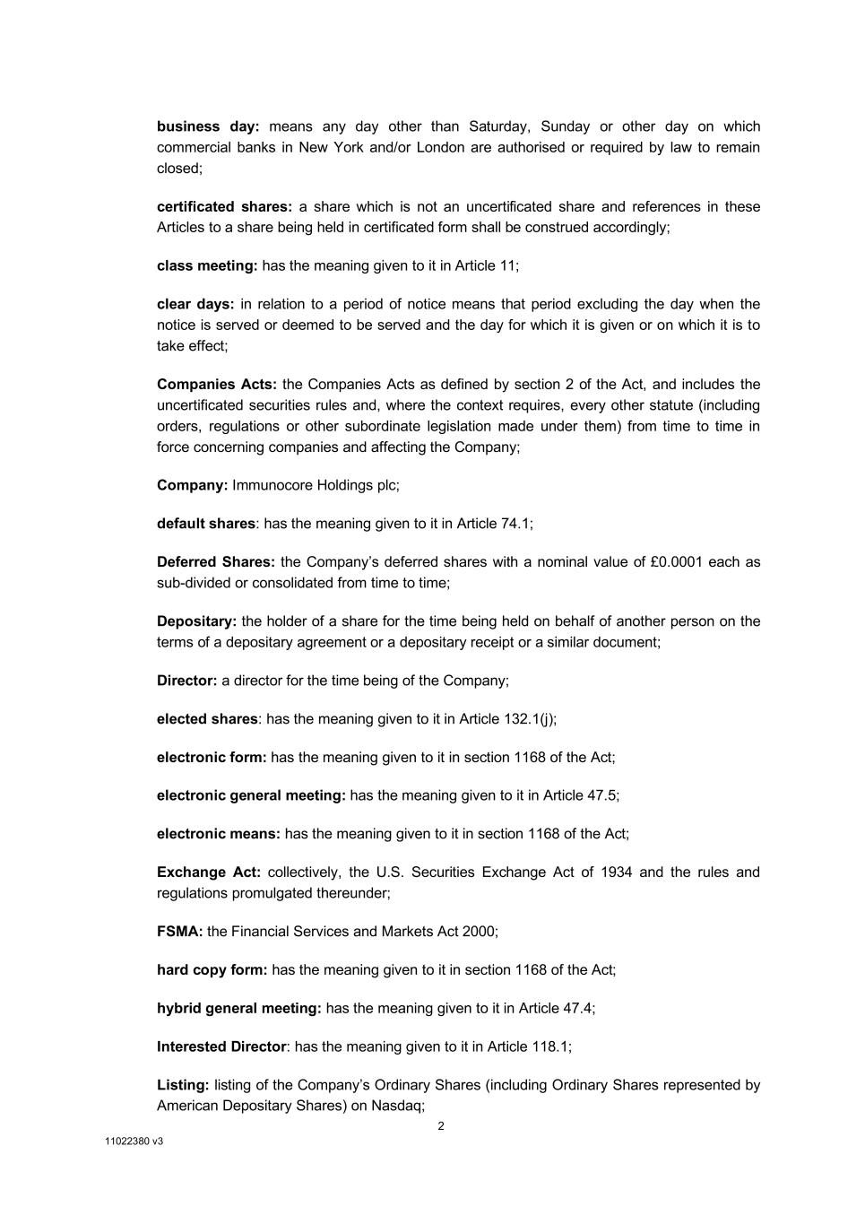 11022380 v3 2 business day: means any day other than Saturday, Sunday or other day on which commercial banks in New York and/or London are authorised or required by law to remain closed; certificated shares: a share which is not an uncertificated share and references in these Articles to a share being held in certificated form shall be construed accordingly; class meeting: has the meaning given to it in Article 11; clear days: in relation to a period of notice means that period excluding the day when the notice is served or deemed to be served and the day for which it is given or on which it is to take effect; Companies Acts: the Companies Acts as defined by section 2 of the Act, and includes the uncertificated securities rules and, where the context requires, every other statute (including orders, regulations or other subordinate legislation made under them) from time to time in force concerning companies and affecting the Company; Company: Immunocore Holdings plc; default shares: has the meaning given to it in Article 74.1; Deferred Shares: the Company’s deferred shares with a nominal value of £0.0001 each as sub-divided or consolidated from time to time; Depositary: the holder of a share for the time being held on behalf of another person on the terms of a depositary agreement or a depositary receipt or a similar document; Director: a director for the time being of the Company; elected shares: has the meaning given to it in Article 132.1(j); electronic form: has the meaning given to it in section 1168 of the Act; electronic general meeting: has the meaning given to it in Article 47.5; electronic means: has the meaning given to it in section 1168 of the Act; Exchange Act: collectively, the U.S. Securities Exchange Act of 1934 and the rules and regulations promulgated thereunder; FSMA: the Financial Services and Markets Act 2000; hard copy form: has the meaning given to it in section 1168 of the Act; hybrid general meeting: has the meaning given to it in Article 47.4; Interested Director: has the meaning given to it in Article 118.1; Listing: listing of the Company’s Ordinary Shares (including Ordinary Shares represented by American Depositary Shares) on Nasdaq;