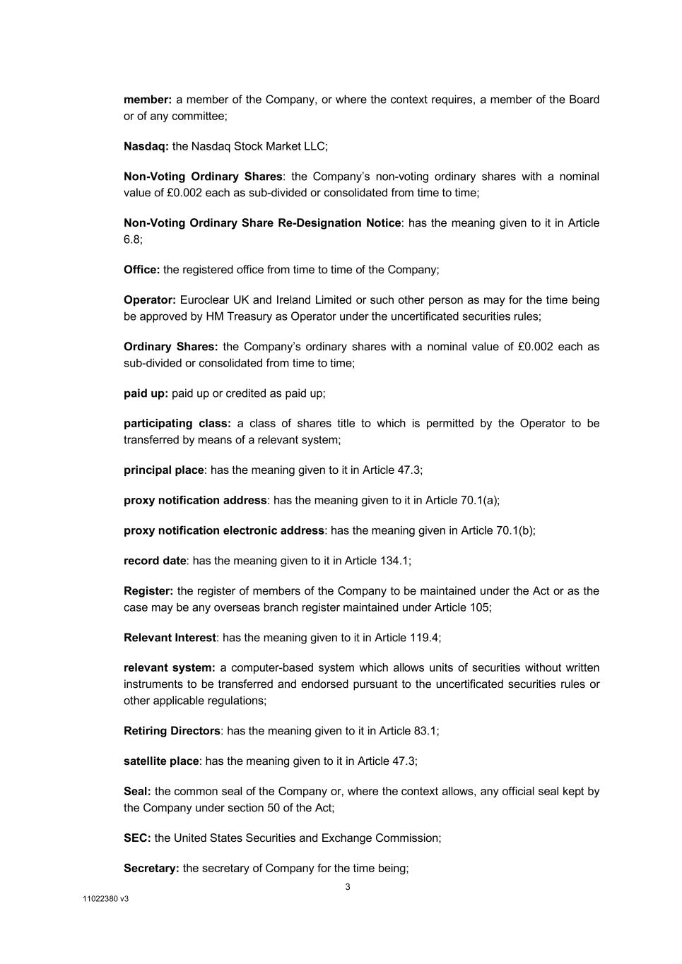 11022380 v3 3 member: a member of the Company, or where the context requires, a member of the Board or of any committee; Nasdaq: the Nasdaq Stock Market LLC; Non-Voting Ordinary Shares: the Company’s non-voting ordinary shares with a nominal value of £0.002 each as sub-divided or consolidated from time to time; Non-Voting Ordinary Share Re-Designation Notice: has the meaning given to it in Article 6.8; Office: the registered office from time to time of the Company; Operator: Euroclear UK and Ireland Limited or such other person as may for the time being be approved by HM Treasury as Operator under the uncertificated securities rules; Ordinary Shares: the Company’s ordinary shares with a nominal value of £0.002 each as sub-divided or consolidated from time to time; paid up: paid up or credited as paid up; participating class: a class of shares title to which is permitted by the Operator to be transferred by means of a relevant system; principal place: has the meaning given to it in Article 47.3; proxy notification address: has the meaning given to it in Article 70.1(a); proxy notification electronic address: has the meaning given in Article 70.1(b); record date: has the meaning given to it in Article 134.1; Register: the register of members of the Company to be maintained under the Act or as the case may be any overseas branch register maintained under Article 105; Relevant Interest: has the meaning given to it in Article 119.4; relevant system: a computer-based system which allows units of securities without written instruments to be transferred and endorsed pursuant to the uncertificated securities rules or other applicable regulations; Retiring Directors: has the meaning given to it in Article 83.1; satellite place: has the meaning given to it in Article 47.3; Seal: the common seal of the Company or, where the context allows, any official seal kept by the Company under section 50 of the Act; SEC: the United States Securities and Exchange Commission; Secretary: the secretary of Company for the time being;