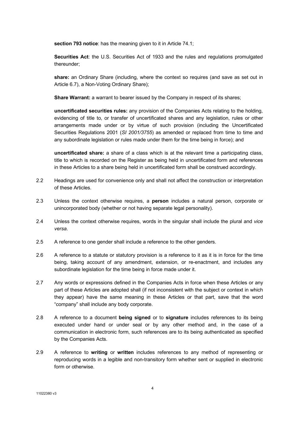 11022380 v3 4 section 793 notice: has the meaning given to it in Article 74.1; Securities Act: the U.S. Securities Act of 1933 and the rules and regulations promulgated thereunder; share: an Ordinary Share (including, where the context so requires (and save as set out in Article 6.7), a Non-Voting Ordinary Share); Share Warrant: a warrant to bearer issued by the Company in respect of its shares; uncertificated securities rules: any provision of the Companies Acts relating to the holding, evidencing of title to, or transfer of uncertificated shares and any legislation, rules or other arrangements made under or by virtue of such provision (including the Uncertificated Securities Regulations 2001 (SI 2001/3755) as amended or replaced from time to time and any subordinate legislation or rules made under them for the time being in force); and uncertificated share: a share of a class which is at the relevant time a participating class, title to which is recorded on the Register as being held in uncertificated form and references in these Articles to a share being held in uncertificated form shall be construed accordingly. 2.2 Headings are used for convenience only and shall not affect the construction or interpretation of these Articles. 2.3 Unless the context otherwise requires, a person includes a natural person, corporate or unincorporated body (whether or not having separate legal personality). 2.4 Unless the context otherwise requires, words in the singular shall include the plural and vice versa. 2.5 A reference to one gender shall include a reference to the other genders. 2.6 A reference to a statute or statutory provision is a reference to it as it is in force for the time being, taking account of any amendment, extension, or re-enactment, and includes any subordinate legislation for the time being in force made under it. 2.7 Any words or expressions defined in the Companies Acts in force when these Articles or any part of these Articles are adopted shall (if not inconsistent with the subject or context in which they appear) have the same meaning in these Articles or that part, save that the word “company” shall include any body corporate. 2.8 A reference to a document being signed or to signature includes references to its being executed under hand or under seal or by any other method and, in the case of a communication in electronic form, such references are to its being authenticated as specified by the Companies Acts. 2.9 A reference to writing or written includes references to any method of representing or reproducing words in a legible and non-transitory form whether sent or supplied in electronic form or otherwise.