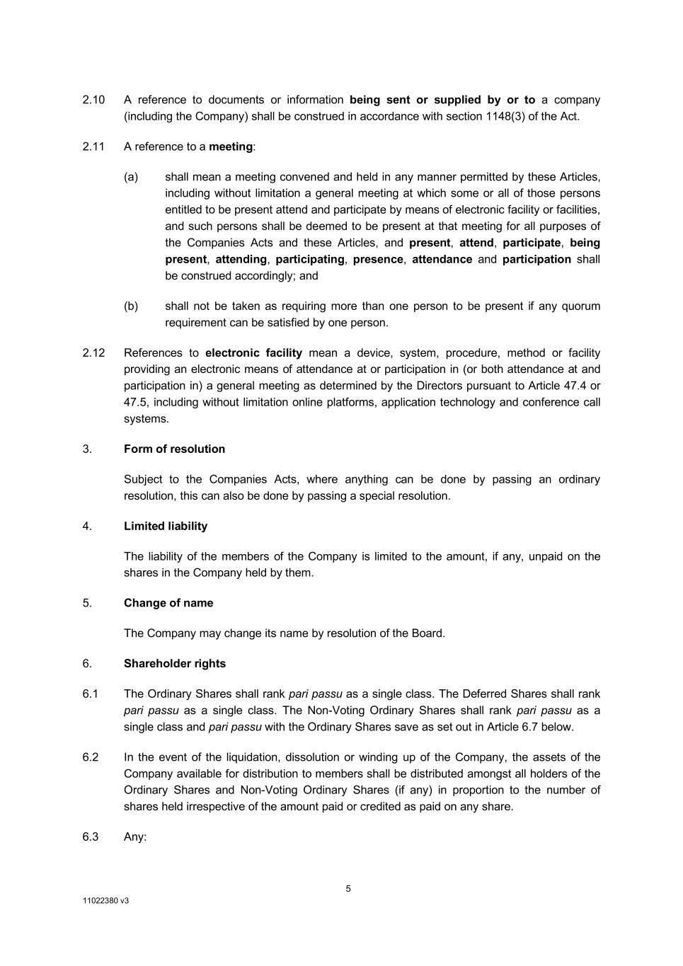 11022380 v3 5 2.10 A reference to documents or information being sent or supplied by or to a company (including the Company) shall be construed in accordance with section 1148(3) of the Act. 2.11 A reference to a meeting: (a) shall mean a meeting convened and held in any manner permitted by these Articles, including without limitation a general meeting at which some or all of those persons entitled to be present attend and participate by means of electronic facility or facilities, and such persons shall be deemed to be present at that meeting for all purposes of the Companies Acts and these Articles, and present, attend, participate, being present, attending, participating, presence, attendance and participation shall be construed accordingly; and (b) shall not be taken as requiring more than one person to be present if any quorum requirement can be satisfied by one person. 2.12 References to electronic facility mean a device, system, procedure, method or facility providing an electronic means of attendance at or participation in (or both attendance at and participation in) a general meeting as determined by the Directors pursuant to Article 47.4 or 47.5, including without limitation online platforms, application technology and conference call systems. 3. Form of resolution Subject to the Companies Acts, where anything can be done by passing an ordinary resolution, this can also be done by passing a special resolution. 4. Limited liability The liability of the members of the Company is limited to the amount, if any, unpaid on the shares in the Company held by them. 5. Change of name The Company may change its name by resolution of the Board. 6. Shareholder rights 6.1 The Ordinary Shares shall rank pari passu as a single class. The Deferred Shares shall rank pari passu as a single class. The Non-Voting Ordinary Shares shall rank pari passu as a single class and pari passu with the Ordinary Shares save as set out in Article 6.7 below. 6.2 In the event of the liquidation, dissolution or winding up of the Company, the assets of the Company available for distribution to members shall be distributed amongst all holders of the Ordinary Shares and Non-Voting Ordinary Shares (if any) in proportion to the number of shares held irrespective of the amount paid or credited as paid on any share. 6.3 Any: