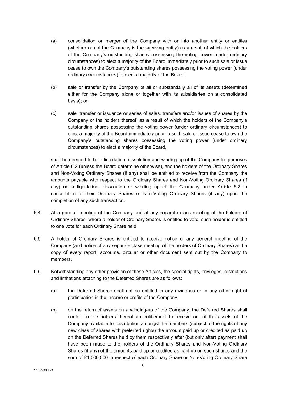 11022380 v3 6 (a) consolidation or merger of the Company with or into another entity or entities (whether or not the Company is the surviving entity) as a result of which the holders of the Company’s outstanding shares possessing the voting power (under ordinary circumstances) to elect a majority of the Board immediately prior to such sale or issue cease to own the Company’s outstanding shares possessing the voting power (under ordinary circumstances) to elect a majority of the Board; (b) sale or transfer by the Company of all or substantially all of its assets (determined either for the Company alone or together with its subsidiaries on a consolidated basis); or (c) sale, transfer or issuance or series of sales, transfers and/or issues of shares by the Company or the holders thereof, as a result of which the holders of the Company’s outstanding shares possessing the voting power (under ordinary circumstances) to elect a majority of the Board immediately prior to such sale or issue cease to own the Company’s outstanding shares possessing the voting power (under ordinary circumstances) to elect a majority of the Board, shall be deemed to be a liquidation, dissolution and winding up of the Company for purposes of Article 6.2 (unless the Board determine otherwise), and the holders of the Ordinary Shares and Non-Voting Ordinary Shares (if any) shall be entitled to receive from the Company the amounts payable with respect to the Ordinary Shares and Non-Voting Ordinary Shares (if any) on a liquidation, dissolution or winding up of the Company under Article 6.2 in cancellation of their Ordinary Shares or Non-Voting Ordinary Shares (if any) upon the completion of any such transaction. 6.4 At a general meeting of the Company and at any separate class meeting of the holders of Ordinary Shares, where a holder of Ordinary Shares is entitled to vote, such holder is entitled to one vote for each Ordinary Share held. 6.5 A holder of Ordinary Shares is entitled to receive notice of any general meeting of the Company (and notice of any separate class meeting of the holders of Ordinary Shares) and a copy of every report, accounts, circular or other document sent out by the Company to members. 6.6 Notwithstanding any other provision of these Articles, the special rights, privileges, restrictions and limitations attaching to the Deferred Shares are as follows: (a) the Deferred Shares shall not be entitled to any dividends or to any other right of participation in the income or profits of the Company; (b) on the return of assets on a winding-up of the Company, the Deferred Shares shall confer on the holders thereof an entitlement to receive out of the assets of the Company available for distribution amongst the members (subject to the rights of any new class of shares with preferred rights) the amount paid up or credited as paid up on the Deferred Shares held by them respectively after (but only after) payment shall have been made to the holders of the Ordinary Shares and Non-Voting Ordinary Shares (if any) of the amounts paid up or credited as paid up on such shares and the sum of £1,000,000 in respect of each Ordinary Share or Non-Voting Ordinary Share