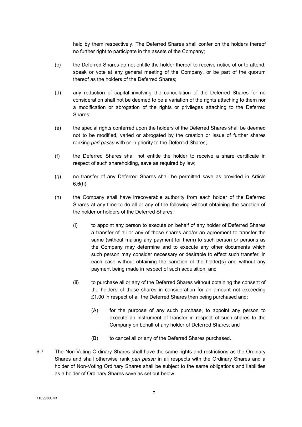 11022380 v3 7 held by them respectively. The Deferred Shares shall confer on the holders thereof no further right to participate in the assets of the Company; (c) the Deferred Shares do not entitle the holder thereof to receive notice of or to attend, speak or vote at any general meeting of the Company, or be part of the quorum thereof as the holders of the Deferred Shares; (d) any reduction of capital involving the cancellation of the Deferred Shares for no consideration shall not be deemed to be a variation of the rights attaching to them nor a modification or abrogation of the rights or privileges attaching to the Deferred Shares; (e) the special rights conferred upon the holders of the Deferred Shares shall be deemed not to be modified, varied or abrogated by the creation or issue of further shares ranking pari passu with or in priority to the Deferred Shares; (f) the Deferred Shares shall not entitle the holder to receive a share certificate in respect of such shareholding, save as required by law; (g) no transfer of any Deferred Shares shall be permitted save as provided in Article 6.6(h); (h) the Company shall have irrecoverable authority from each holder of the Deferred Shares at any time to do all or any of the following without obtaining the sanction of the holder or holders of the Deferred Shares: (i) to appoint any person to execute on behalf of any holder of Deferred Shares a transfer of all or any of those shares and/or an agreement to transfer the same (without making any payment for them) to such person or persons as the Company may determine and to execute any other documents which such person may consider necessary or desirable to effect such transfer, in each case without obtaining the sanction of the holder(s) and without any payment being made in respect of such acquisition; and (ii) to purchase all or any of the Deferred Shares without obtaining the consent of the holders of those shares in consideration for an amount not exceeding £1.00 in respect of all the Deferred Shares then being purchased and: (A) for the purpose of any such purchase, to appoint any person to execute an instrument of transfer in respect of such shares to the Company on behalf of any holder of Deferred Shares; and (B) to cancel all or any of the Deferred Shares purchased. 6.7 The Non-Voting Ordinary Shares shall have the same rights and restrictions as the Ordinary Shares and shall otherwise rank pari passu in all respects with the Ordinary Shares and a holder of Non-Voting Ordinary Shares shall be subject to the same obligations and liabilities as a holder of Ordinary Shares save as set out below: