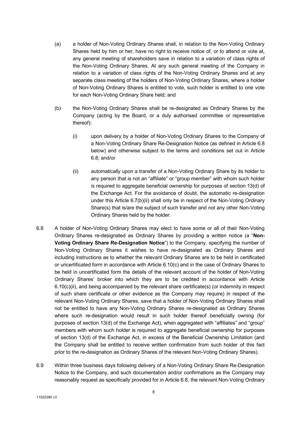 11022380 v3 8 (a) a holder of Non-Voting Ordinary Shares shall, in relation to the Non-Voting Ordinary Shares held by him or her, have no right to receive notice of, or to attend or vote at, any general meeting of shareholders save in relation to a variation of class rights of the Non-Voting Ordinary Shares. At any such general meeting of the Company in relation to a variation of class rights of the Non-Voting Ordinary Shares and at any separate class meeting of the holders of Non-Voting Ordinary Shares, where a holder of Non-Voting Ordinary Shares is entitled to vote, such holder is entitled to one vote for each Non-Voting Ordinary Share held; and (b) the Non-Voting Ordinary Shares shall be re-designated as Ordinary Shares by the Company (acting by the Board, or a duly authorised committee or representative thereof): (i) upon delivery by a holder of Non-Voting Ordinary Shares to the Company of a Non-Voting Ordinary Share Re-Designation Notice (as defined in Article 6.8 below) and otherwise subject to the terms and conditions set out in Article 6.8; and/or (ii) automatically upon a transfer of a Non-Voting Ordinary Share by its holder to any person that is not an “affiliate” or “group member” with whom such holder is required to aggregate beneficial ownership for purposes of section 13(d) of the Exchange Act. For the avoidance of doubt, the automatic re-designation under this Article 6.7(b)(ii) shall only be in respect of the Non-Voting Ordinary Share(s) that is/are the subject of such transfer and not any other Non-Voting Ordinary Shares held by the holder. 6.8 A holder of Non-Voting Ordinary Shares may elect to have some or all of their Non-Voting Ordinary Shares re-designated as Ordinary Shares by providing a written notice (a “Non- Voting Ordinary Share Re-Designation Notice”) to the Company, specifying the number of Non-Voting Ordinary Shares it wishes to have re-designated as Ordinary Shares and including instructions as to whether the relevant Ordinary Shares are to be held in certificated or uncertificated form in accordance with Article 6.10(c) and in the case of Ordinary Shares to be held in uncertificated form the details of the relevant account of the holder of Non-Voting Ordinary Shares’ broker into which they are to be credited in accordance with Article 6.10(c)(ii), and being accompanied by the relevant share certificate(s) (or indemnity in respect of such share certificate or other evidence as the Company may require) in respect of the relevant Non-Voting Ordinary Shares, save that a holder of Non-Voting Ordinary Shares shall not be entitled to have any Non-Voting Ordinary Shares re-designated as Ordinary Shares where such re-designation would result in such holder thereof beneficially owning (for purposes of section 13(d) of the Exchange Act), when aggregated with “affiliates” and “group” members with whom such holder is required to aggregate beneficial ownership for purposes of section 13(d) of the Exchange Act, in excess of the Beneficial Ownership Limitation (and the Company shall be entitled to receive written confirmation from such holder of this fact prior to the re-designation as Ordinary Shares of the relevant Non-Voting Ordinary Shares). 6.9 Within three business days following delivery of a Non-Voting Ordinary Share Re-Designation Notice to the Company, and such documentation and/or confirmations as the Company may reasonably request as specifically provided for in Article 6.8, the relevant Non-Voting Ordinary