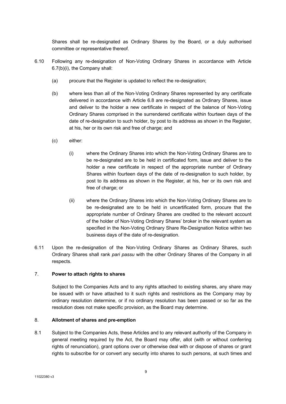 11022380 v3 9 Shares shall be re-designated as Ordinary Shares by the Board, or a duly authorised committee or representative thereof. 6.10 Following any re-designation of Non-Voting Ordinary Shares in accordance with Article 6.7(b)(i), the Company shall: (a) procure that the Register is updated to reflect the re-designation; (b) where less than all of the Non-Voting Ordinary Shares represented by any certificate delivered in accordance with Article 6.8 are re-designated as Ordinary Shares, issue and deliver to the holder a new certificate in respect of the balance of Non-Voting Ordinary Shares comprised in the surrendered certificate within fourteen days of the date of re-designation to such holder, by post to its address as shown in the Register, at his, her or its own risk and free of charge; and (c) either: (i) where the Ordinary Shares into which the Non-Voting Ordinary Shares are to be re-designated are to be held in certificated form, issue and deliver to the holder a new certificate in respect of the appropriate number of Ordinary Shares within fourteen days of the date of re-designation to such holder, by post to its address as shown in the Register, at his, her or its own risk and free of charge; or (ii) where the Ordinary Shares into which the Non-Voting Ordinary Shares are to be re-designated are to be held in uncertificated form, procure that the appropriate number of Ordinary Shares are credited to the relevant account of the holder of Non-Voting Ordinary Shares’ broker in the relevant system as specified in the Non-Voting Ordinary Share Re-Designation Notice within two business days of the date of re-designation. 6.11 Upon the re-designation of the Non-Voting Ordinary Shares as Ordinary Shares, such Ordinary Shares shall rank pari passu with the other Ordinary Shares of the Company in all respects. 7. Power to attach rights to shares Subject to the Companies Acts and to any rights attached to existing shares, any share may be issued with or have attached to it such rights and restrictions as the Company may by ordinary resolution determine, or if no ordinary resolution has been passed or so far as the resolution does not make specific provision, as the Board may determine. 8. Allotment of shares and pre-emption 8.1 Subject to the Companies Acts, these Articles and to any relevant authority of the Company in general meeting required by the Act, the Board may offer, allot (with or without conferring rights of renunciation), grant options over or otherwise deal with or dispose of shares or grant rights to subscribe for or convert any security into shares to such persons, at such times and
