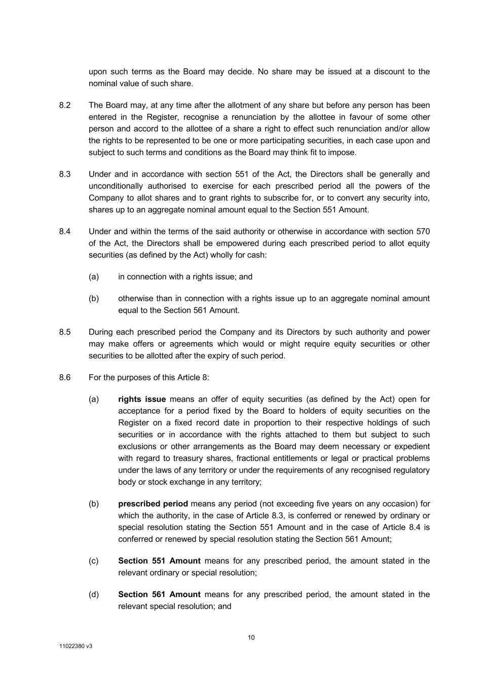 11022380 v3 10 upon such terms as the Board may decide. No share may be issued at a discount to the nominal value of such share. 8.2 The Board may, at any time after the allotment of any share but before any person has been entered in the Register, recognise a renunciation by the allottee in favour of some other person and accord to the allottee of a share a right to effect such renunciation and/or allow the rights to be represented to be one or more participating securities, in each case upon and subject to such terms and conditions as the Board may think fit to impose. 8.3 Under and in accordance with section 551 of the Act, the Directors shall be generally and unconditionally authorised to exercise for each prescribed period all the powers of the Company to allot shares and to grant rights to subscribe for, or to convert any security into, shares up to an aggregate nominal amount equal to the Section 551 Amount. 8.4 Under and within the terms of the said authority or otherwise in accordance with section 570 of the Act, the Directors shall be empowered during each prescribed period to allot equity securities (as defined by the Act) wholly for cash: (a) in connection with a rights issue; and (b) otherwise than in connection with a rights issue up to an aggregate nominal amount equal to the Section 561 Amount. 8.5 During each prescribed period the Company and its Directors by such authority and power may make offers or agreements which would or might require equity securities or other securities to be allotted after the expiry of such period. 8.6 For the purposes of this Article 8: (a) rights issue means an offer of equity securities (as defined by the Act) open for acceptance for a period fixed by the Board to holders of equity securities on the Register on a fixed record date in proportion to their respective holdings of such securities or in accordance with the rights attached to them but subject to such exclusions or other arrangements as the Board may deem necessary or expedient with regard to treasury shares, fractional entitlements or legal or practical problems under the laws of any territory or under the requirements of any recognised regulatory body or stock exchange in any territory; (b) prescribed period means any period (not exceeding five years on any occasion) for which the authority, in the case of Article 8.3, is conferred or renewed by ordinary or special resolution stating the Section 551 Amount and in the case of Article 8.4 is conferred or renewed by special resolution stating the Section 561 Amount; (c) Section 551 Amount means for any prescribed period, the amount stated in the relevant ordinary or special resolution; (d) Section 561 Amount means for any prescribed period, the amount stated in the relevant special resolution; and
