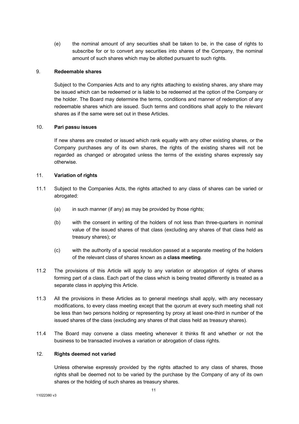 11022380 v3 11 (e) the nominal amount of any securities shall be taken to be, in the case of rights to subscribe for or to convert any securities into shares of the Company, the nominal amount of such shares which may be allotted pursuant to such rights. 9. Redeemable shares Subject to the Companies Acts and to any rights attaching to existing shares, any share may be issued which can be redeemed or is liable to be redeemed at the option of the Company or the holder. The Board may determine the terms, conditions and manner of redemption of any redeemable shares which are issued. Such terms and conditions shall apply to the relevant shares as if the same were set out in these Articles. 10. Pari passu issues If new shares are created or issued which rank equally with any other existing shares, or the Company purchases any of its own shares, the rights of the existing shares will not be regarded as changed or abrogated unless the terms of the existing shares expressly say otherwise. 11. Variation of rights 11.1 Subject to the Companies Acts, the rights attached to any class of shares can be varied or abrogated: (a) in such manner (if any) as may be provided by those rights; (b) with the consent in writing of the holders of not less than three-quarters in nominal value of the issued shares of that class (excluding any shares of that class held as treasury shares); or (c) with the authority of a special resolution passed at a separate meeting of the holders of the relevant class of shares known as a class meeting. 11.2 The provisions of this Article will apply to any variation or abrogation of rights of shares forming part of a class. Each part of the class which is being treated differently is treated as a separate class in applying this Article. 11.3 All the provisions in these Articles as to general meetings shall apply, with any necessary modifications, to every class meeting except that the quorum at every such meeting shall not be less than two persons holding or representing by proxy at least one-third in number of the issued shares of the class (excluding any shares of that class held as treasury shares). 11.4 The Board may convene a class meeting whenever it thinks fit and whether or not the business to be transacted involves a variation or abrogation of class rights. 12. Rights deemed not varied Unless otherwise expressly provided by the rights attached to any class of shares, those rights shall be deemed not to be varied by the purchase by the Company of any of its own shares or the holding of such shares as treasury shares.