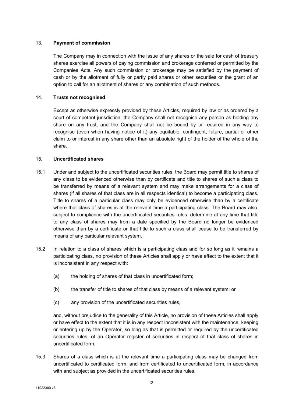 11022380 v3 12 13. Payment of commission The Company may in connection with the issue of any shares or the sale for cash of treasury shares exercise all powers of paying commission and brokerage conferred or permitted by the Companies Acts. Any such commission or brokerage may be satisfied by the payment of cash or by the allotment of fully or partly paid shares or other securities or the grant of an option to call for an allotment of shares or any combination of such methods. 14. Trusts not recognised Except as otherwise expressly provided by these Articles, required by law or as ordered by a court of competent jurisdiction, the Company shall not recognise any person as holding any share on any trust, and the Company shall not be bound by or required in any way to recognise (even when having notice of it) any equitable, contingent, future, partial or other claim to or interest in any share other than an absolute right of the holder of the whole of the share. 15. Uncertificated shares 15.1 Under and subject to the uncertificated securities rules, the Board may permit title to shares of any class to be evidenced otherwise than by certificate and title to shares of such a class to be transferred by means of a relevant system and may make arrangements for a class of shares (if all shares of that class are in all respects identical) to become a participating class. Title to shares of a particular class may only be evidenced otherwise than by a certificate where that class of shares is at the relevant time a participating class. The Board may also, subject to compliance with the uncertificated securities rules, determine at any time that title to any class of shares may from a date specified by the Board no longer be evidenced otherwise than by a certificate or that title to such a class shall cease to be transferred by means of any particular relevant system. 15.2 In relation to a class of shares which is a participating class and for so long as it remains a participating class, no provision of these Articles shall apply or have effect to the extent that it is inconsistent in any respect with: (a) the holding of shares of that class in uncertificated form; (b) the transfer of title to shares of that class by means of a relevant system; or (c) any provision of the uncertificated securities rules, and, without prejudice to the generality of this Article, no provision of these Articles shall apply or have effect to the extent that it is in any respect inconsistent with the maintenance, keeping or entering up by the Operator, so long as that is permitted or required by the uncertificated securities rules, of an Operator register of securities in respect of that class of shares in uncertificated form. 15.3 Shares of a class which is at the relevant time a participating class may be changed from uncertificated to certificated form, and from certificated to uncertificated form, in accordance with and subject as provided in the uncertificated securities rules.