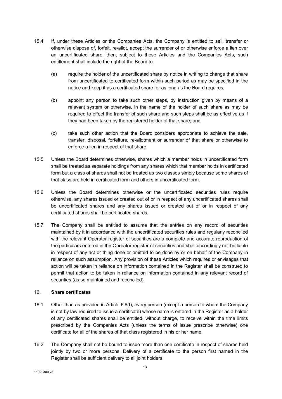 11022380 v3 13 15.4 If, under these Articles or the Companies Acts, the Company is entitled to sell, transfer or otherwise dispose of, forfeit, re-allot, accept the surrender of or otherwise enforce a lien over an uncertificated share, then, subject to these Articles and the Companies Acts, such entitlement shall include the right of the Board to: (a) require the holder of the uncertificated share by notice in writing to change that share from uncertificated to certificated form within such period as may be specified in the notice and keep it as a certificated share for as long as the Board requires; (b) appoint any person to take such other steps, by instruction given by means of a relevant system or otherwise, in the name of the holder of such share as may be required to effect the transfer of such share and such steps shall be as effective as if they had been taken by the registered holder of that share; and (c) take such other action that the Board considers appropriate to achieve the sale, transfer, disposal, forfeiture, re-allotment or surrender of that share or otherwise to enforce a lien in respect of that share. 15.5 Unless the Board determines otherwise, shares which a member holds in uncertificated form shall be treated as separate holdings from any shares which that member holds in certificated form but a class of shares shall not be treated as two classes simply because some shares of that class are held in certificated form and others in uncertificated form. 15.6 Unless the Board determines otherwise or the uncertificated securities rules require otherwise, any shares issued or created out of or in respect of any uncertificated shares shall be uncertificated shares and any shares issued or created out of or in respect of any certificated shares shall be certificated shares. 15.7 The Company shall be entitled to assume that the entries on any record of securities maintained by it in accordance with the uncertificated securities rules and regularly reconciled with the relevant Operator register of securities are a complete and accurate reproduction of the particulars entered in the Operator register of securities and shall accordingly not be liable in respect of any act or thing done or omitted to be done by or on behalf of the Company in reliance on such assumption. Any provision of these Articles which requires or envisages that action will be taken in reliance on information contained in the Register shall be construed to permit that action to be taken in reliance on information contained in any relevant record of securities (as so maintained and reconciled). 16. Share certificates 16.1 Other than as provided in Article 6.6(f), every person (except a person to whom the Company is not by law required to issue a certificate) whose name is entered in the Register as a holder of any certificated shares shall be entitled, without charge, to receive within the time limits prescribed by the Companies Acts (unless the terms of issue prescribe otherwise) one certificate for all of the shares of that class registered in his or her name. 16.2 The Company shall not be bound to issue more than one certificate in respect of shares held jointly by two or more persons. Delivery of a certificate to the person first named in the Register shall be sufficient delivery to all joint holders.