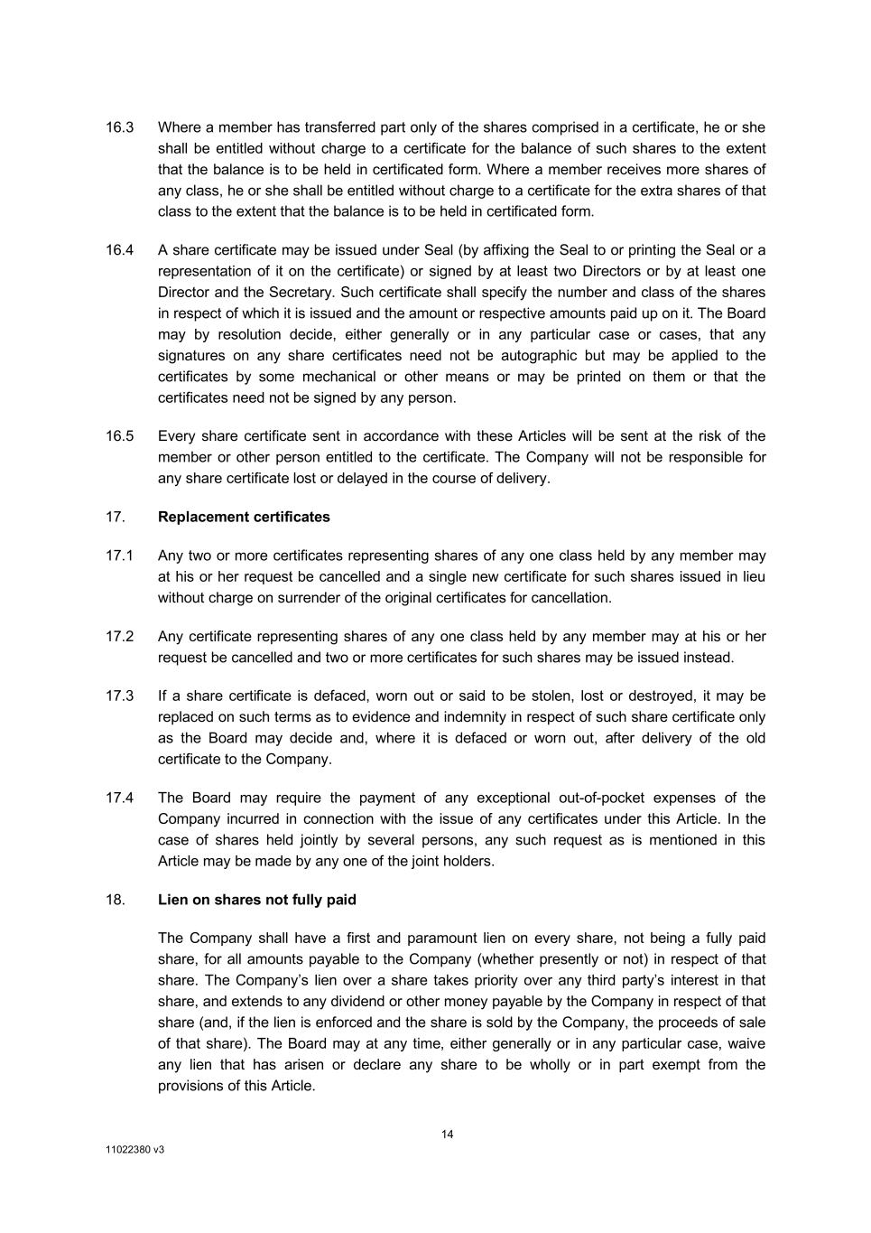 11022380 v3 14 16.3 Where a member has transferred part only of the shares comprised in a certificate, he or she shall be entitled without charge to a certificate for the balance of such shares to the extent that the balance is to be held in certificated form. Where a member receives more shares of any class, he or she shall be entitled without charge to a certificate for the extra shares of that class to the extent that the balance is to be held in certificated form. 16.4 A share certificate may be issued under Seal (by affixing the Seal to or printing the Seal or a representation of it on the certificate) or signed by at least two Directors or by at least one Director and the Secretary. Such certificate shall specify the number and class of the shares in respect of which it is issued and the amount or respective amounts paid up on it. The Board may by resolution decide, either generally or in any particular case or cases, that any signatures on any share certificates need not be autographic but may be applied to the certificates by some mechanical or other means or may be printed on them or that the certificates need not be signed by any person. 16.5 Every share certificate sent in accordance with these Articles will be sent at the risk of the member or other person entitled to the certificate. The Company will not be responsible for any share certificate lost or delayed in the course of delivery. 17. Replacement certificates 17.1 Any two or more certificates representing shares of any one class held by any member may at his or her request be cancelled and a single new certificate for such shares issued in lieu without charge on surrender of the original certificates for cancellation. 17.2 Any certificate representing shares of any one class held by any member may at his or her request be cancelled and two or more certificates for such shares may be issued instead. 17.3 If a share certificate is defaced, worn out or said to be stolen, lost or destroyed, it may be replaced on such terms as to evidence and indemnity in respect of such share certificate only as the Board may decide and, where it is defaced or worn out, after delivery of the old certificate to the Company. 17.4 The Board may require the payment of any exceptional out-of-pocket expenses of the Company incurred in connection with the issue of any certificates under this Article. In the case of shares held jointly by several persons, any such request as is mentioned in this Article may be made by any one of the joint holders. 18. Lien on shares not fully paid The Company shall have a first and paramount lien on every share, not being a fully paid share, for all amounts payable to the Company (whether presently or not) in respect of that share. The Company’s lien over a share takes priority over any third party’s interest in that share, and extends to any dividend or other money payable by the Company in respect of that share (and, if the lien is enforced and the share is sold by the Company, the proceeds of sale of that share). The Board may at any time, either generally or in any particular case, waive any lien that has arisen or declare any share to be wholly or in part exempt from the provisions of this Article.