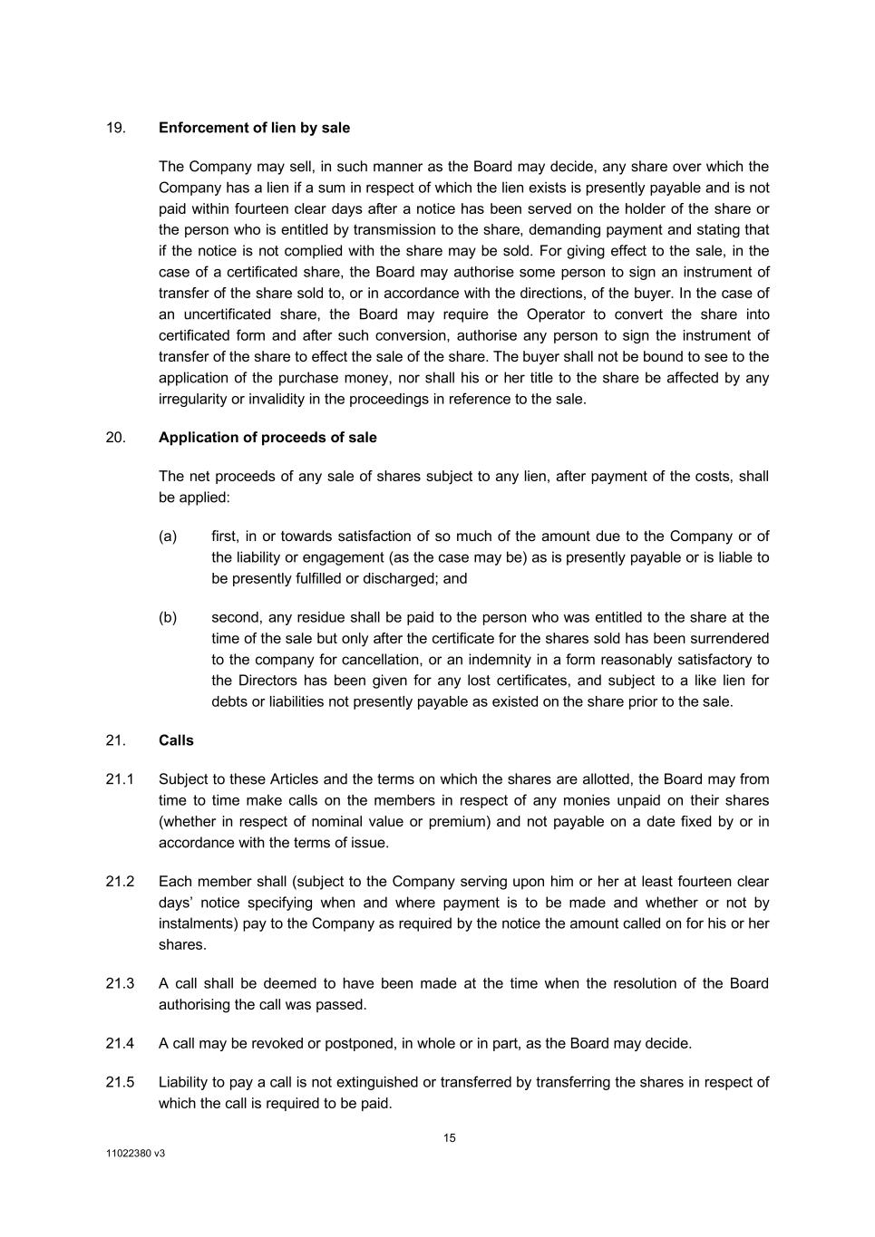 11022380 v3 15 19. Enforcement of lien by sale The Company may sell, in such manner as the Board may decide, any share over which the Company has a lien if a sum in respect of which the lien exists is presently payable and is not paid within fourteen clear days after a notice has been served on the holder of the share or the person who is entitled by transmission to the share, demanding payment and stating that if the notice is not complied with the share may be sold. For giving effect to the sale, in the case of a certificated share, the Board may authorise some person to sign an instrument of transfer of the share sold to, or in accordance with the directions, of the buyer. In the case of an uncertificated share, the Board may require the Operator to convert the share into certificated form and after such conversion, authorise any person to sign the instrument of transfer of the share to effect the sale of the share. The buyer shall not be bound to see to the application of the purchase money, nor shall his or her title to the share be affected by any irregularity or invalidity in the proceedings in reference to the sale. 20. Application of proceeds of sale The net proceeds of any sale of shares subject to any lien, after payment of the costs, shall be applied: (a) first, in or towards satisfaction of so much of the amount due to the Company or of the liability or engagement (as the case may be) as is presently payable or is liable to be presently fulfilled or discharged; and (b) second, any residue shall be paid to the person who was entitled to the share at the time of the sale but only after the certificate for the shares sold has been surrendered to the company for cancellation, or an indemnity in a form reasonably satisfactory to the Directors has been given for any lost certificates, and subject to a like lien for debts or liabilities not presently payable as existed on the share prior to the sale. 21. Calls 21.1 Subject to these Articles and the terms on which the shares are allotted, the Board may from time to time make calls on the members in respect of any monies unpaid on their shares (whether in respect of nominal value or premium) and not payable on a date fixed by or in accordance with the terms of issue. 21.2 Each member shall (subject to the Company serving upon him or her at least fourteen clear days’ notice specifying when and where payment is to be made and whether or not by instalments) pay to the Company as required by the notice the amount called on for his or her shares. 21.3 A call shall be deemed to have been made at the time when the resolution of the Board authorising the call was passed. 21.4 A call may be revoked or postponed, in whole or in part, as the Board may decide. 21.5 Liability to pay a call is not extinguished or transferred by transferring the shares in respect of which the call is required to be paid.