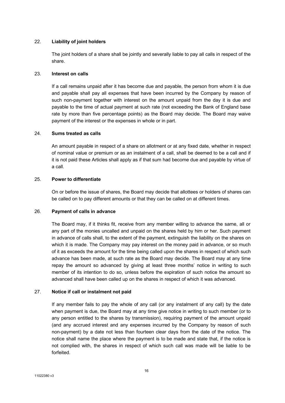 11022380 v3 16 22. Liability of joint holders The joint holders of a share shall be jointly and severally liable to pay all calls in respect of the share. 23. Interest on calls If a call remains unpaid after it has become due and payable, the person from whom it is due and payable shall pay all expenses that have been incurred by the Company by reason of such non-payment together with interest on the amount unpaid from the day it is due and payable to the time of actual payment at such rate (not exceeding the Bank of England base rate by more than five percentage points) as the Board may decide. The Board may waive payment of the interest or the expenses in whole or in part. 24. Sums treated as calls An amount payable in respect of a share on allotment or at any fixed date, whether in respect of nominal value or premium or as an instalment of a call, shall be deemed to be a call and if it is not paid these Articles shall apply as if that sum had become due and payable by virtue of a call. 25. Power to differentiate On or before the issue of shares, the Board may decide that allottees or holders of shares can be called on to pay different amounts or that they can be called on at different times. 26. Payment of calls in advance The Board may, if it thinks fit, receive from any member willing to advance the same, all or any part of the monies uncalled and unpaid on the shares held by him or her. Such payment in advance of calls shall, to the extent of the payment, extinguish the liability on the shares on which it is made. The Company may pay interest on the money paid in advance, or so much of it as exceeds the amount for the time being called upon the shares in respect of which such advance has been made, at such rate as the Board may decide. The Board may at any time repay the amount so advanced by giving at least three months’ notice in writing to such member of its intention to do so, unless before the expiration of such notice the amount so advanced shall have been called up on the shares in respect of which it was advanced. 27. Notice if call or instalment not paid If any member fails to pay the whole of any call (or any instalment of any call) by the date when payment is due, the Board may at any time give notice in writing to such member (or to any person entitled to the shares by transmission), requiring payment of the amount unpaid (and any accrued interest and any expenses incurred by the Company by reason of such non-payment) by a date not less than fourteen clear days from the date of the notice. The notice shall name the place where the payment is to be made and state that, if the notice is not complied with, the shares in respect of which such call was made will be liable to be forfeited.