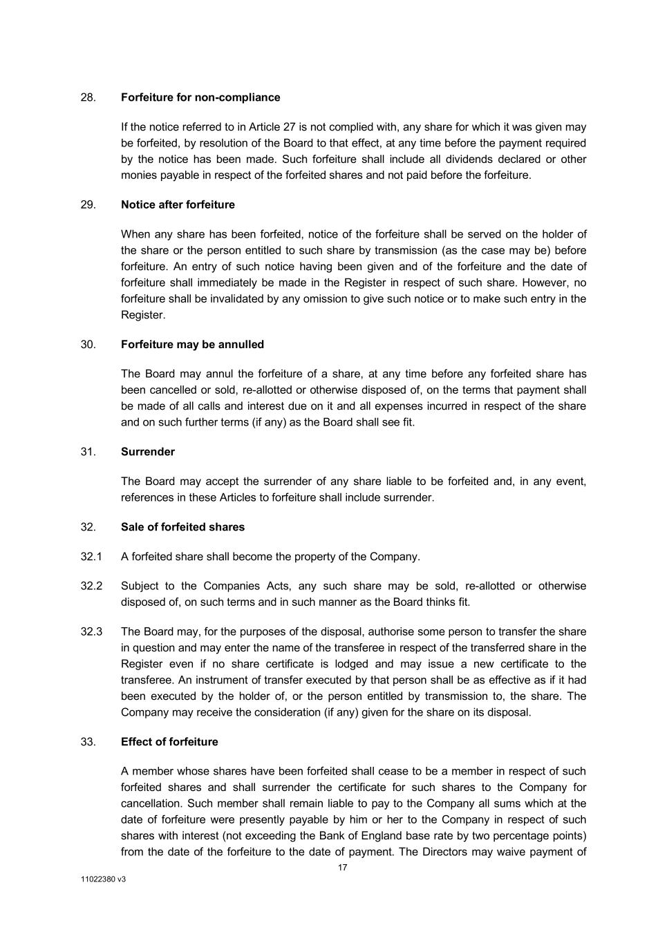 11022380 v3 17 28. Forfeiture for non-compliance If the notice referred to in Article 27 is not complied with, any share for which it was given may be forfeited, by resolution of the Board to that effect, at any time before the payment required by the notice has been made. Such forfeiture shall include all dividends declared or other monies payable in respect of the forfeited shares and not paid before the forfeiture. 29. Notice after forfeiture When any share has been forfeited, notice of the forfeiture shall be served on the holder of the share or the person entitled to such share by transmission (as the case may be) before forfeiture. An entry of such notice having been given and of the forfeiture and the date of forfeiture shall immediately be made in the Register in respect of such share. However, no forfeiture shall be invalidated by any omission to give such notice or to make such entry in the Register. 30. Forfeiture may be annulled The Board may annul the forfeiture of a share, at any time before any forfeited share has been cancelled or sold, re-allotted or otherwise disposed of, on the terms that payment shall be made of all calls and interest due on it and all expenses incurred in respect of the share and on such further terms (if any) as the Board shall see fit. 31. Surrender The Board may accept the surrender of any share liable to be forfeited and, in any event, references in these Articles to forfeiture shall include surrender. 32. Sale of forfeited shares 32.1 A forfeited share shall become the property of the Company. 32.2 Subject to the Companies Acts, any such share may be sold, re-allotted or otherwise disposed of, on such terms and in such manner as the Board thinks fit. 32.3 The Board may, for the purposes of the disposal, authorise some person to transfer the share in question and may enter the name of the transferee in respect of the transferred share in the Register even if no share certificate is lodged and may issue a new certificate to the transferee. An instrument of transfer executed by that person shall be as effective as if it had been executed by the holder of, or the person entitled by transmission to, the share. The Company may receive the consideration (if any) given for the share on its disposal. 33. Effect of forfeiture A member whose shares have been forfeited shall cease to be a member in respect of such forfeited shares and shall surrender the certificate for such shares to the Company for cancellation. Such member shall remain liable to pay to the Company all sums which at the date of forfeiture were presently payable by him or her to the Company in respect of such shares with interest (not exceeding the Bank of England base rate by two percentage points) from the date of the forfeiture to the date of payment. The Directors may waive payment of