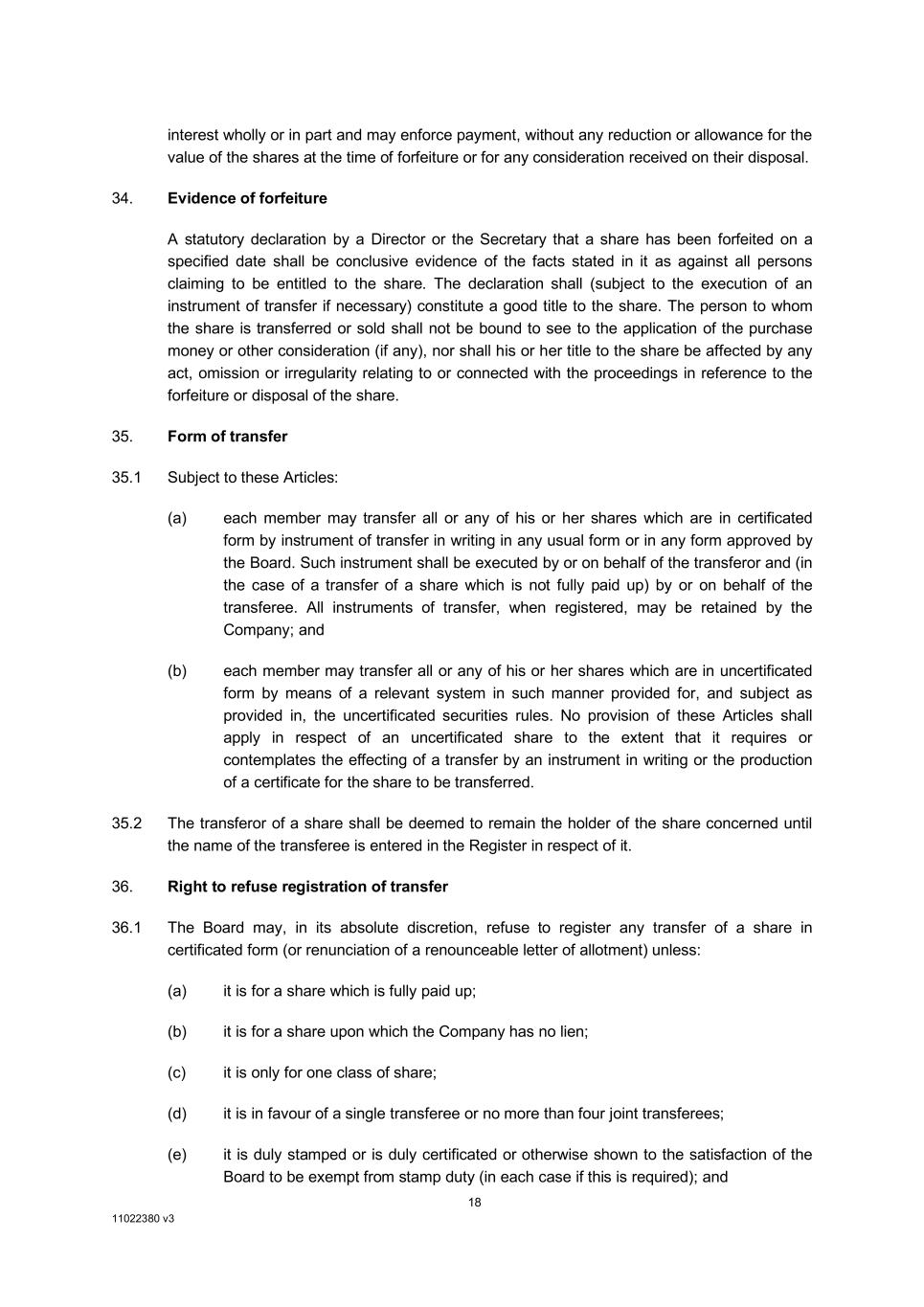 11022380 v3 18 interest wholly or in part and may enforce payment, without any reduction or allowance for the value of the shares at the time of forfeiture or for any consideration received on their disposal. 34. Evidence of forfeiture A statutory declaration by a Director or the Secretary that a share has been forfeited on a specified date shall be conclusive evidence of the facts stated in it as against all persons claiming to be entitled to the share. The declaration shall (subject to the execution of an instrument of transfer if necessary) constitute a good title to the share. The person to whom the share is transferred or sold shall not be bound to see to the application of the purchase money or other consideration (if any), nor shall his or her title to the share be affected by any act, omission or irregularity relating to or connected with the proceedings in reference to the forfeiture or disposal of the share. 35. Form of transfer 35.1 Subject to these Articles: (a) each member may transfer all or any of his or her shares which are in certificated form by instrument of transfer in writing in any usual form or in any form approved by the Board. Such instrument shall be executed by or on behalf of the transferor and (in the case of a transfer of a share which is not fully paid up) by or on behalf of the transferee. All instruments of transfer, when registered, may be retained by the Company; and (b) each member may transfer all or any of his or her shares which are in uncertificated form by means of a relevant system in such manner provided for, and subject as provided in, the uncertificated securities rules. No provision of these Articles shall apply in respect of an uncertificated share to the extent that it requires or contemplates the effecting of a transfer by an instrument in writing or the production of a certificate for the share to be transferred. 35.2 The transferor of a share shall be deemed to remain the holder of the share concerned until the name of the transferee is entered in the Register in respect of it. 36. Right to refuse registration of transfer 36.1 The Board may, in its absolute discretion, refuse to register any transfer of a share in certificated form (or renunciation of a renounceable letter of allotment) unless: (a) it is for a share which is fully paid up; (b) it is for a share upon which the Company has no lien; (c) it is only for one class of share; (d) it is in favour of a single transferee or no more than four joint transferees; (e) it is duly stamped or is duly certificated or otherwise shown to the satisfaction of the Board to be exempt from stamp duty (in each case if this is required); and