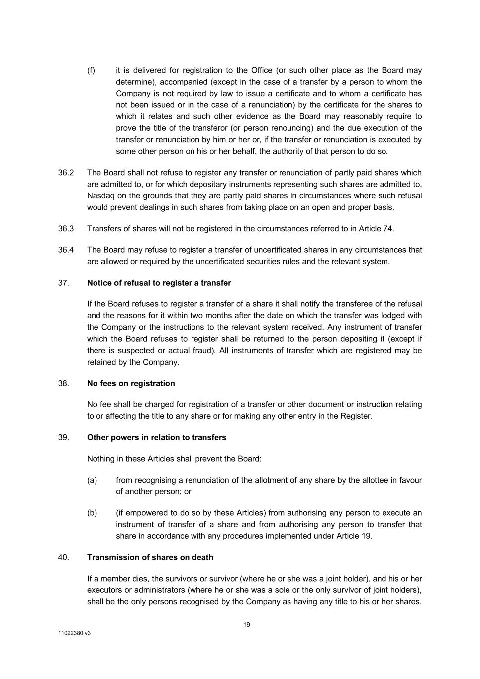 11022380 v3 19 (f) it is delivered for registration to the Office (or such other place as the Board may determine), accompanied (except in the case of a transfer by a person to whom the Company is not required by law to issue a certificate and to whom a certificate has not been issued or in the case of a renunciation) by the certificate for the shares to which it relates and such other evidence as the Board may reasonably require to prove the title of the transferor (or person renouncing) and the due execution of the transfer or renunciation by him or her or, if the transfer or renunciation is executed by some other person on his or her behalf, the authority of that person to do so. 36.2 The Board shall not refuse to register any transfer or renunciation of partly paid shares which are admitted to, or for which depositary instruments representing such shares are admitted to, Nasdaq on the grounds that they are partly paid shares in circumstances where such refusal would prevent dealings in such shares from taking place on an open and proper basis. 36.3 Transfers of shares will not be registered in the circumstances referred to in Article 74. 36.4 The Board may refuse to register a transfer of uncertificated shares in any circumstances that are allowed or required by the uncertificated securities rules and the relevant system. 37. Notice of refusal to register a transfer If the Board refuses to register a transfer of a share it shall notify the transferee of the refusal and the reasons for it within two months after the date on which the transfer was lodged with the Company or the instructions to the relevant system received. Any instrument of transfer which the Board refuses to register shall be returned to the person depositing it (except if there is suspected or actual fraud). All instruments of transfer which are registered may be retained by the Company. 38. No fees on registration No fee shall be charged for registration of a transfer or other document or instruction relating to or affecting the title to any share or for making any other entry in the Register. 39. Other powers in relation to transfers Nothing in these Articles shall prevent the Board: (a) from recognising a renunciation of the allotment of any share by the allottee in favour of another person; or (b) (if empowered to do so by these Articles) from authorising any person to execute an instrument of transfer of a share and from authorising any person to transfer that share in accordance with any procedures implemented under Article 19. 40. Transmission of shares on death If a member dies, the survivors or survivor (where he or she was a joint holder), and his or her executors or administrators (where he or she was a sole or the only survivor of joint holders), shall be the only persons recognised by the Company as having any title to his or her shares.