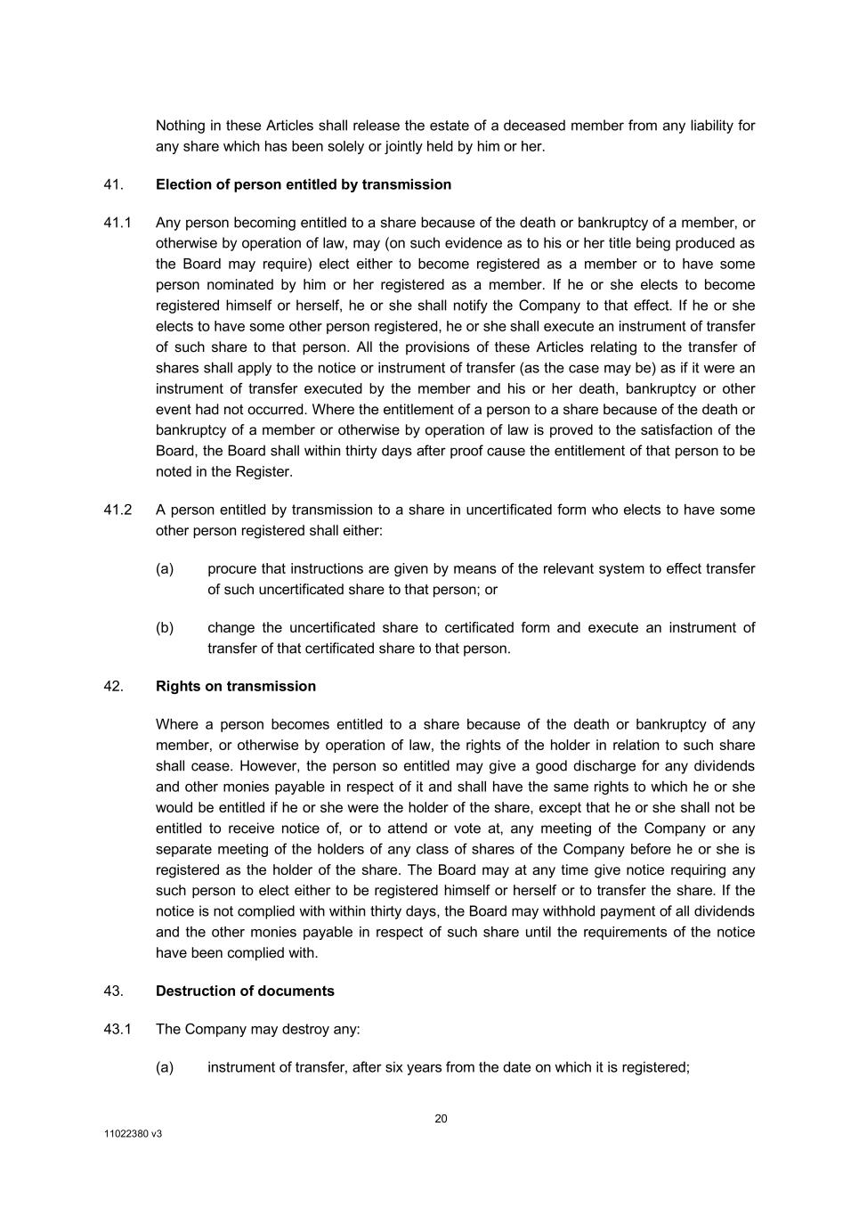 11022380 v3 20 Nothing in these Articles shall release the estate of a deceased member from any liability for any share which has been solely or jointly held by him or her. 41. Election of person entitled by transmission 41.1 Any person becoming entitled to a share because of the death or bankruptcy of a member, or otherwise by operation of law, may (on such evidence as to his or her title being produced as the Board may require) elect either to become registered as a member or to have some person nominated by him or her registered as a member. If he or she elects to become registered himself or herself, he or she shall notify the Company to that effect. If he or she elects to have some other person registered, he or she shall execute an instrument of transfer of such share to that person. All the provisions of these Articles relating to the transfer of shares shall apply to the notice or instrument of transfer (as the case may be) as if it were an instrument of transfer executed by the member and his or her death, bankruptcy or other event had not occurred. Where the entitlement of a person to a share because of the death or bankruptcy of a member or otherwise by operation of law is proved to the satisfaction of the Board, the Board shall within thirty days after proof cause the entitlement of that person to be noted in the Register. 41.2 A person entitled by transmission to a share in uncertificated form who elects to have some other person registered shall either: (a) procure that instructions are given by means of the relevant system to effect transfer of such uncertificated share to that person; or (b) change the uncertificated share to certificated form and execute an instrument of transfer of that certificated share to that person. 42. Rights on transmission Where a person becomes entitled to a share because of the death or bankruptcy of any member, or otherwise by operation of law, the rights of the holder in relation to such share shall cease. However, the person so entitled may give a good discharge for any dividends and other monies payable in respect of it and shall have the same rights to which he or she would be entitled if he or she were the holder of the share, except that he or she shall not be entitled to receive notice of, or to attend or vote at, any meeting of the Company or any separate meeting of the holders of any class of shares of the Company before he or she is registered as the holder of the share. The Board may at any time give notice requiring any such person to elect either to be registered himself or herself or to transfer the share. If the notice is not complied with within thirty days, the Board may withhold payment of all dividends and the other monies payable in respect of such share until the requirements of the notice have been complied with. 43. Destruction of documents 43.1 The Company may destroy any: (a) instrument of transfer, after six years from the date on which it is registered;
