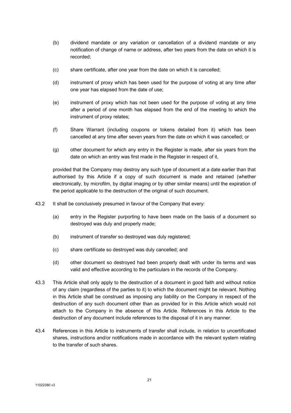 11022380 v3 21 (b) dividend mandate or any variation or cancellation of a dividend mandate or any notification of change of name or address, after two years from the date on which it is recorded; (c) share certificate, after one year from the date on which it is cancelled; (d) instrument of proxy which has been used for the purpose of voting at any time after one year has elapsed from the date of use; (e) instrument of proxy which has not been used for the purpose of voting at any time after a period of one month has elapsed from the end of the meeting to which the instrument of proxy relates; (f) Share Warrant (including coupons or tokens detailed from it) which has been cancelled at any time after seven years from the date on which it was cancelled; or (g) other document for which any entry in the Register is made, after six years from the date on which an entry was first made in the Register in respect of it, provided that the Company may destroy any such type of document at a date earlier than that authorised by this Article if a copy of such document is made and retained (whether electronically, by microfilm, by digital imaging or by other similar means) until the expiration of the period applicable to the destruction of the original of such document. 43.2 It shall be conclusively presumed in favour of the Company that every: (a) entry in the Register purporting to have been made on the basis of a document so destroyed was duly and properly made; (b) instrument of transfer so destroyed was duly registered; (c) share certificate so destroyed was duly cancelled; and (d) other document so destroyed had been properly dealt with under its terms and was valid and effective according to the particulars in the records of the Company. 43.3 This Article shall only apply to the destruction of a document in good faith and without notice of any claim (regardless of the parties to it) to which the document might be relevant. Nothing in this Article shall be construed as imposing any liability on the Company in respect of the destruction of any such document other than as provided for in this Article which would not attach to the Company in the absence of this Article. References in this Article to the destruction of any document include references to the disposal of it in any manner. 43.4 References in this Article to instruments of transfer shall include, in relation to uncertificated shares, instructions and/or notifications made in accordance with the relevant system relating to the transfer of such shares.