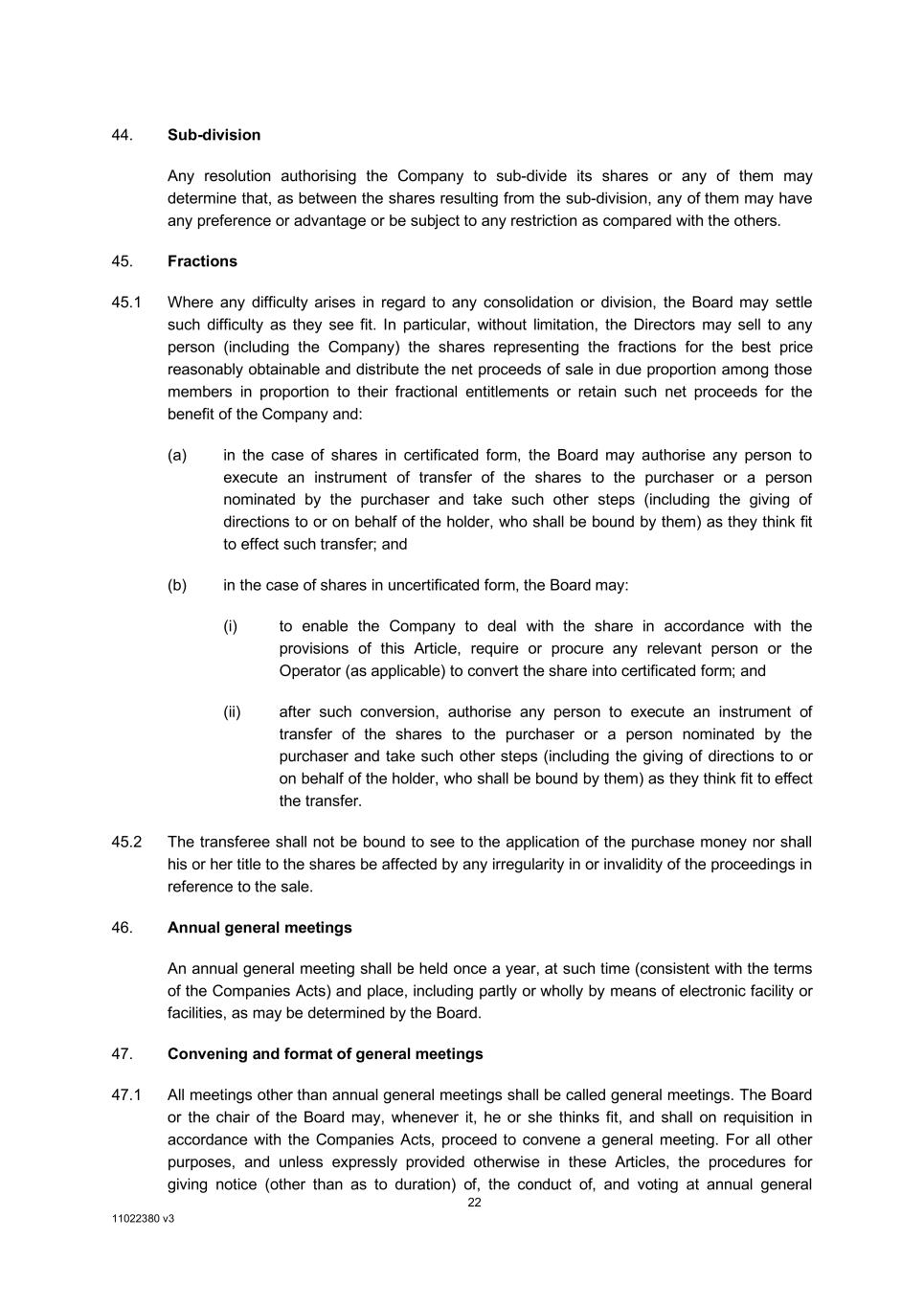 11022380 v3 22 44. Sub-division Any resolution authorising the Company to sub-divide its shares or any of them may determine that, as between the shares resulting from the sub-division, any of them may have any preference or advantage or be subject to any restriction as compared with the others. 45. Fractions 45.1 Where any difficulty arises in regard to any consolidation or division, the Board may settle such difficulty as they see fit. In particular, without limitation, the Directors may sell to any person (including the Company) the shares representing the fractions for the best price reasonably obtainable and distribute the net proceeds of sale in due proportion among those members in proportion to their fractional entitlements or retain such net proceeds for the benefit of the Company and: (a) in the case of shares in certificated form, the Board may authorise any person to execute an instrument of transfer of the shares to the purchaser or a person nominated by the purchaser and take such other steps (including the giving of directions to or on behalf of the holder, who shall be bound by them) as they think fit to effect such transfer; and (b) in the case of shares in uncertificated form, the Board may: (i) to enable the Company to deal with the share in accordance with the provisions of this Article, require or procure any relevant person or the Operator (as applicable) to convert the share into certificated form; and (ii) after such conversion, authorise any person to execute an instrument of transfer of the shares to the purchaser or a person nominated by the purchaser and take such other steps (including the giving of directions to or on behalf of the holder, who shall be bound by them) as they think fit to effect the transfer. 45.2 The transferee shall not be bound to see to the application of the purchase money nor shall his or her title to the shares be affected by any irregularity in or invalidity of the proceedings in reference to the sale. 46. Annual general meetings An annual general meeting shall be held once a year, at such time (consistent with the terms of the Companies Acts) and place, including partly or wholly by means of electronic facility or facilities, as may be determined by the Board. 47. Convening and format of general meetings 47.1 All meetings other than annual general meetings shall be called general meetings. The Board or the chair of the Board may, whenever it, he or she thinks fit, and shall on requisition in accordance with the Companies Acts, proceed to convene a general meeting. For all other purposes, and unless expressly provided otherwise in these Articles, the procedures for giving notice (other than as to duration) of, the conduct of, and voting at annual general