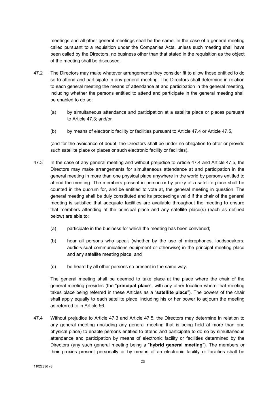 11022380 v3 23 meetings and all other general meetings shall be the same. In the case of a general meeting called pursuant to a requisition under the Companies Acts, unless such meeting shall have been called by the Directors, no business other than that stated in the requisition as the object of the meeting shall be discussed. 47.2 The Directors may make whatever arrangements they consider fit to allow those entitled to do so to attend and participate in any general meeting. The Directors shall determine in relation to each general meeting the means of attendance at and participation in the general meeting, including whether the persons entitled to attend and participate in the general meeting shall be enabled to do so: (a) by simultaneous attendance and participation at a satellite place or places pursuant to Article 47.3; and/or (b) by means of electronic facility or facilities pursuant to Article 47.4 or Article 47.5, (and for the avoidance of doubt, the Directors shall be under no obligation to offer or provide such satellite place or places or such electronic facility or facilities). 47.3 In the case of any general meeting and without prejudice to Article 47.4 and Article 47.5, the Directors may make arrangements for simultaneous attendance at and participation in the general meeting in more than one physical place anywhere in the world by persons entitled to attend the meeting. The members present in person or by proxy at a satellite place shall be counted in the quorum for, and be entitled to vote at, the general meeting in question. The general meeting shall be duly constituted and its proceedings valid if the chair of the general meeting is satisfied that adequate facilities are available throughout the meeting to ensure that members attending at the principal place and any satellite place(s) (each as defined below) are able to: (a) participate in the business for which the meeting has been convened; (b) hear all persons who speak (whether by the use of microphones, loudspeakers, audio-visual communications equipment or otherwise) in the principal meeting place and any satellite meeting place; and (c) be heard by all other persons so present in the same way. The general meeting shall be deemed to take place at the place where the chair of the general meeting presides (the “principal place”, with any other location where that meeting takes place being referred in these Articles as a “satellite place”). The powers of the chair shall apply equally to each satellite place, including his or her power to adjourn the meeting as referred to in Article 56. 47.4 Without prejudice to Article 47.3 and Article 47.5, the Directors may determine in relation to any general meeting (including any general meeting that is being held at more than one physical place) to enable persons entitled to attend and participate to do so by simultaneous attendance and participation by means of electronic facility or facilities determined by the Directors (any such general meeting being a “hybrid general meeting”). The members or their proxies present personally or by means of an electronic facility or facilities shall be