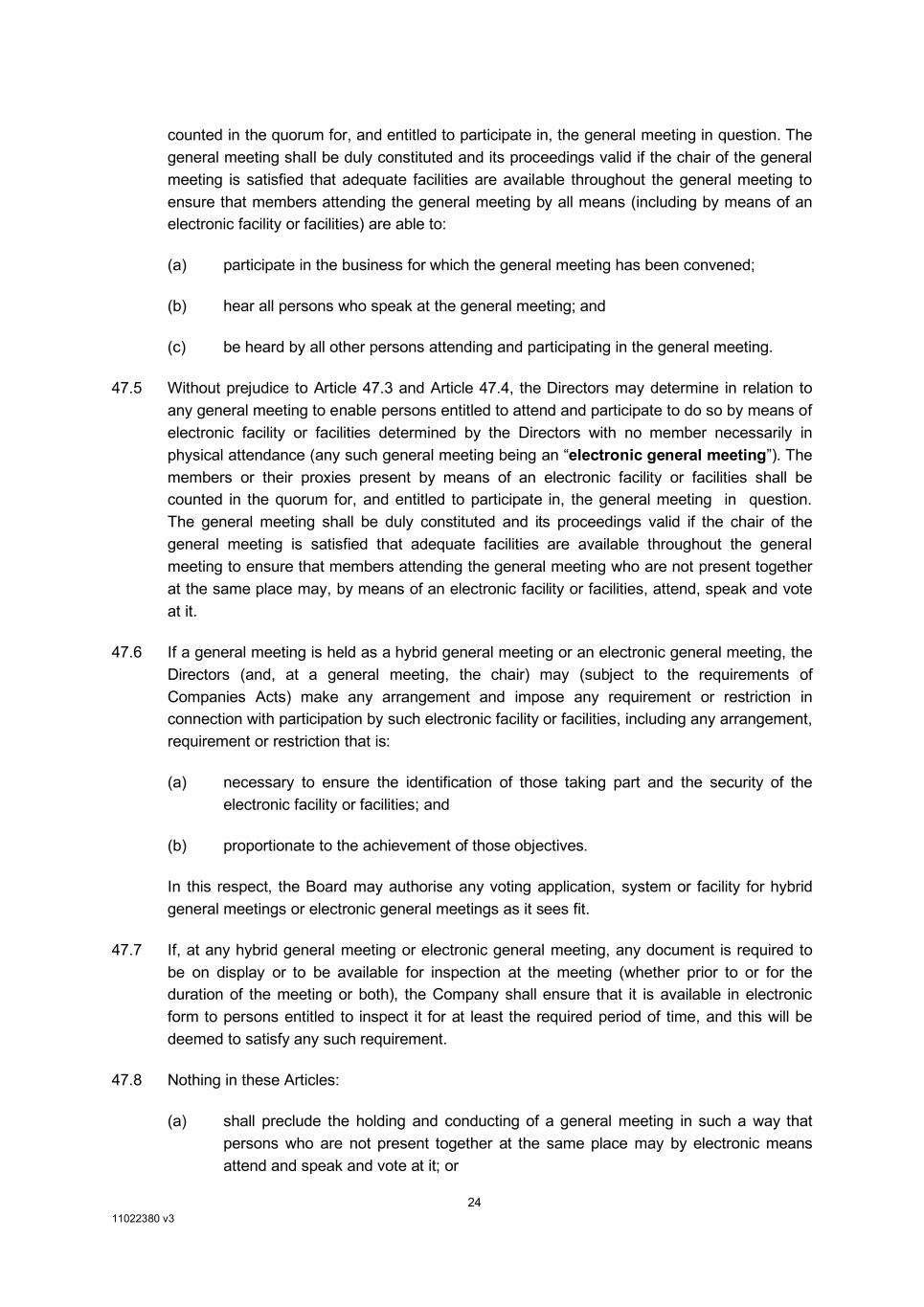 11022380 v3 24 counted in the quorum for, and entitled to participate in, the general meeting in question. The general meeting shall be duly constituted and its proceedings valid if the chair of the general meeting is satisfied that adequate facilities are available throughout the general meeting to ensure that members attending the general meeting by all means (including by means of an electronic facility or facilities) are able to: (a) participate in the business for which the general meeting has been convened; (b) hear all persons who speak at the general meeting; and (c) be heard by all other persons attending and participating in the general meeting. 47.5 Without prejudice to Article 47.3 and Article 47.4, the Directors may determine in relation to any general meeting to enable persons entitled to attend and participate to do so by means of electronic facility or facilities determined by the Directors with no member necessarily in physical attendance (any such general meeting being an “electronic general meeting”). The members or their proxies present by means of an electronic facility or facilities shall be counted in the quorum for, and entitled to participate in, the general meeting in question. The general meeting shall be duly constituted and its proceedings valid if the chair of the general meeting is satisfied that adequate facilities are available throughout the general meeting to ensure that members attending the general meeting who are not present together at the same place may, by means of an electronic facility or facilities, attend, speak and vote at it. 47.6 If a general meeting is held as a hybrid general meeting or an electronic general meeting, the Directors (and, at a general meeting, the chair) may (subject to the requirements of Companies Acts) make any arrangement and impose any requirement or restriction in connection with participation by such electronic facility or facilities, including any arrangement, requirement or restriction that is: (a) necessary to ensure the identification of those taking part and the security of the electronic facility or facilities; and (b) proportionate to the achievement of those objectives. In this respect, the Board may authorise any voting application, system or facility for hybrid general meetings or electronic general meetings as it sees fit. 47.7 If, at any hybrid general meeting or electronic general meeting, any document is required to be on display or to be available for inspection at the meeting (whether prior to or for the duration of the meeting or both), the Company shall ensure that it is available in electronic form to persons entitled to inspect it for at least the required period of time, and this will be deemed to satisfy any such requirement. 47.8 Nothing in these Articles: (a) shall preclude the holding and conducting of a general meeting in such a way that persons who are not present together at the same place may by electronic means attend and speak and vote at it; or