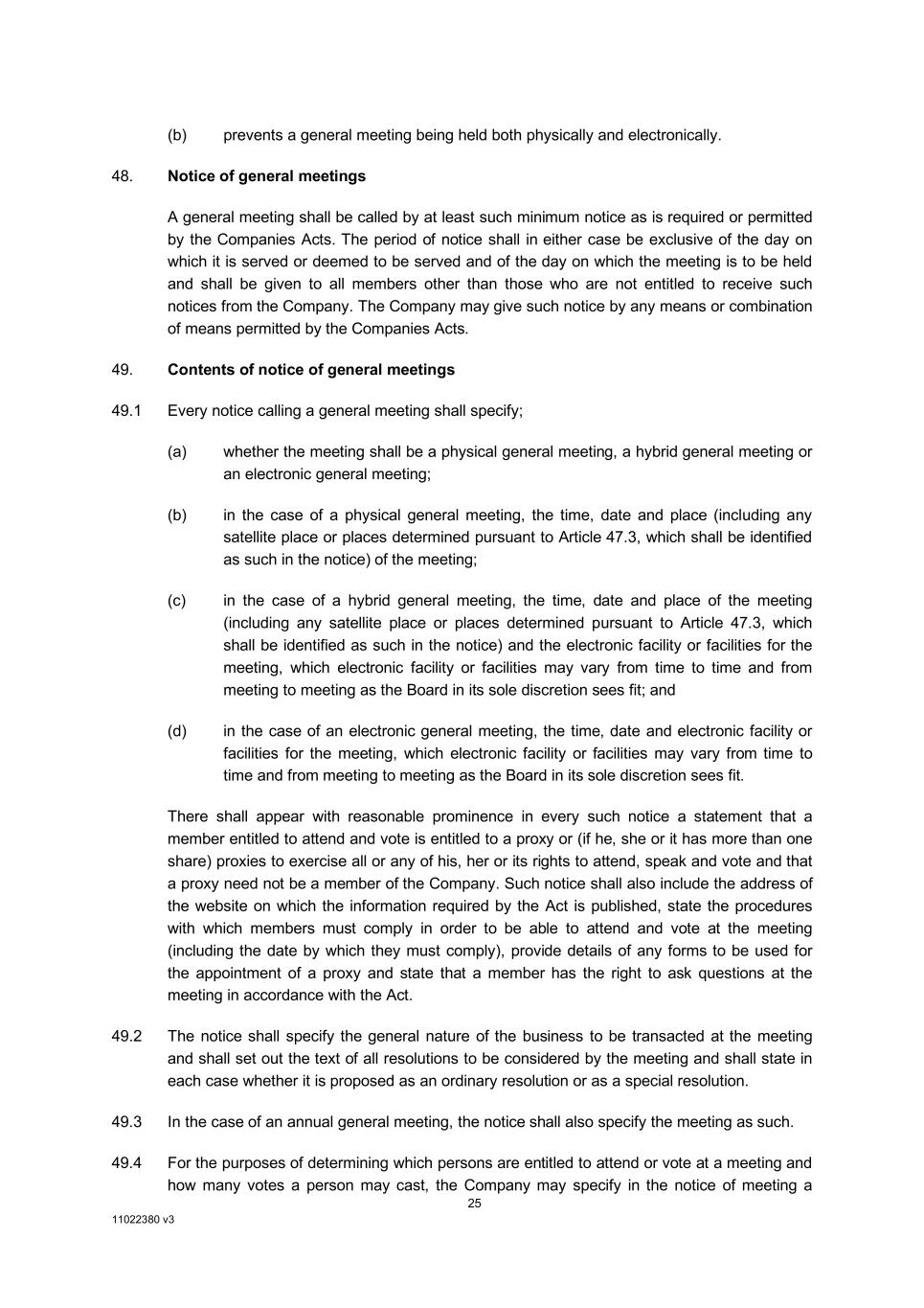 11022380 v3 25 (b) prevents a general meeting being held both physically and electronically. 48. Notice of general meetings A general meeting shall be called by at least such minimum notice as is required or permitted by the Companies Acts. The period of notice shall in either case be exclusive of the day on which it is served or deemed to be served and of the day on which the meeting is to be held and shall be given to all members other than those who are not entitled to receive such notices from the Company. The Company may give such notice by any means or combination of means permitted by the Companies Acts. 49. Contents of notice of general meetings 49.1 Every notice calling a general meeting shall specify; (a) whether the meeting shall be a physical general meeting, a hybrid general meeting or an electronic general meeting; (b) in the case of a physical general meeting, the time, date and place (including any satellite place or places determined pursuant to Article 47.3, which shall be identified as such in the notice) of the meeting; (c) in the case of a hybrid general meeting, the time, date and place of the meeting (including any satellite place or places determined pursuant to Article 47.3, which shall be identified as such in the notice) and the electronic facility or facilities for the meeting, which electronic facility or facilities may vary from time to time and from meeting to meeting as the Board in its sole discretion sees fit; and (d) in the case of an electronic general meeting, the time, date and electronic facility or facilities for the meeting, which electronic facility or facilities may vary from time to time and from meeting to meeting as the Board in its sole discretion sees fit. There shall appear with reasonable prominence in every such notice a statement that a member entitled to attend and vote is entitled to a proxy or (if he, she or it has more than one share) proxies to exercise all or any of his, her or its rights to attend, speak and vote and that a proxy need not be a member of the Company. Such notice shall also include the address of the website on which the information required by the Act is published, state the procedures with which members must comply in order to be able to attend and vote at the meeting (including the date by which they must comply), provide details of any forms to be used for the appointment of a proxy and state that a member has the right to ask questions at the meeting in accordance with the Act. 49.2 The notice shall specify the general nature of the business to be transacted at the meeting and shall set out the text of all resolutions to be considered by the meeting and shall state in each case whether it is proposed as an ordinary resolution or as a special resolution. 49.3 In the case of an annual general meeting, the notice shall also specify the meeting as such. 49.4 For the purposes of determining which persons are entitled to attend or vote at a meeting and how many votes a person may cast, the Company may specify in the notice of meeting a