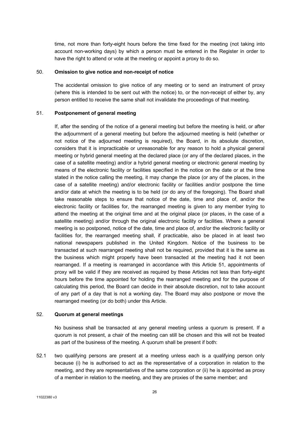 11022380 v3 26 time, not more than forty-eight hours before the time fixed for the meeting (not taking into account non-working days) by which a person must be entered in the Register in order to have the right to attend or vote at the meeting or appoint a proxy to do so. 50. Omission to give notice and non-receipt of notice The accidental omission to give notice of any meeting or to send an instrument of proxy (where this is intended to be sent out with the notice) to, or the non-receipt of either by, any person entitled to receive the same shall not invalidate the proceedings of that meeting. 51. Postponement of general meeting If, after the sending of the notice of a general meeting but before the meeting is held, or after the adjournment of a general meeting but before the adjourned meeting is held (whether or not notice of the adjourned meeting is required), the Board, in its absolute discretion, considers that it is impracticable or unreasonable for any reason to hold a physical general meeting or hybrid general meeting at the declared place (or any of the declared places, in the case of a satellite meeting) and/or a hybrid general meeting or electronic general meeting by means of the electronic facility or facilities specified in the notice on the date or at the time stated in the notice calling the meeting, it may change the place (or any of the places, in the case of a satellite meeting) and/or electronic facility or facilities and/or postpone the time and/or date at which the meeting is to be held (or do any of the foregoing). The Board shall take reasonable steps to ensure that notice of the date, time and place of, and/or the electronic facility or facilities for, the rearranged meeting is given to any member trying to attend the meeting at the original time and at the original place (or places, in the case of a satellite meeting) and/or through the original electronic facility or facilities. Where a general meeting is so postponed, notice of the date, time and place of, and/or the electronic facility or facilities for, the rearranged meeting shall, if practicable, also be placed in at least two national newspapers published in the United Kingdom. Notice of the business to be transacted at such rearranged meeting shall not be required, provided that it is the same as the business which might properly have been transacted at the meeting had it not been rearranged. If a meeting is rearranged in accordance with this Article 51, appointments of proxy will be valid if they are received as required by these Articles not less than forty-eight hours before the time appointed for holding the rearranged meeting and for the purpose of calculating this period, the Board can decide in their absolute discretion, not to take account of any part of a day that is not a working day. The Board may also postpone or move the rearranged meeting (or do both) under this Article. 52. Quorum at general meetings No business shall be transacted at any general meeting unless a quorum is present. If a quorum is not present, a chair of the meeting can still be chosen and this will not be treated as part of the business of the meeting. A quorum shall be present if both: 52.1 two qualifying persons are present at a meeting unless each is a qualifying person only because (i) he is authorised to act as the representative of a corporation in relation to the meeting, and they are representatives of the same corporation or (ii) he is appointed as proxy of a member in relation to the meeting, and they are proxies of the same member; and
