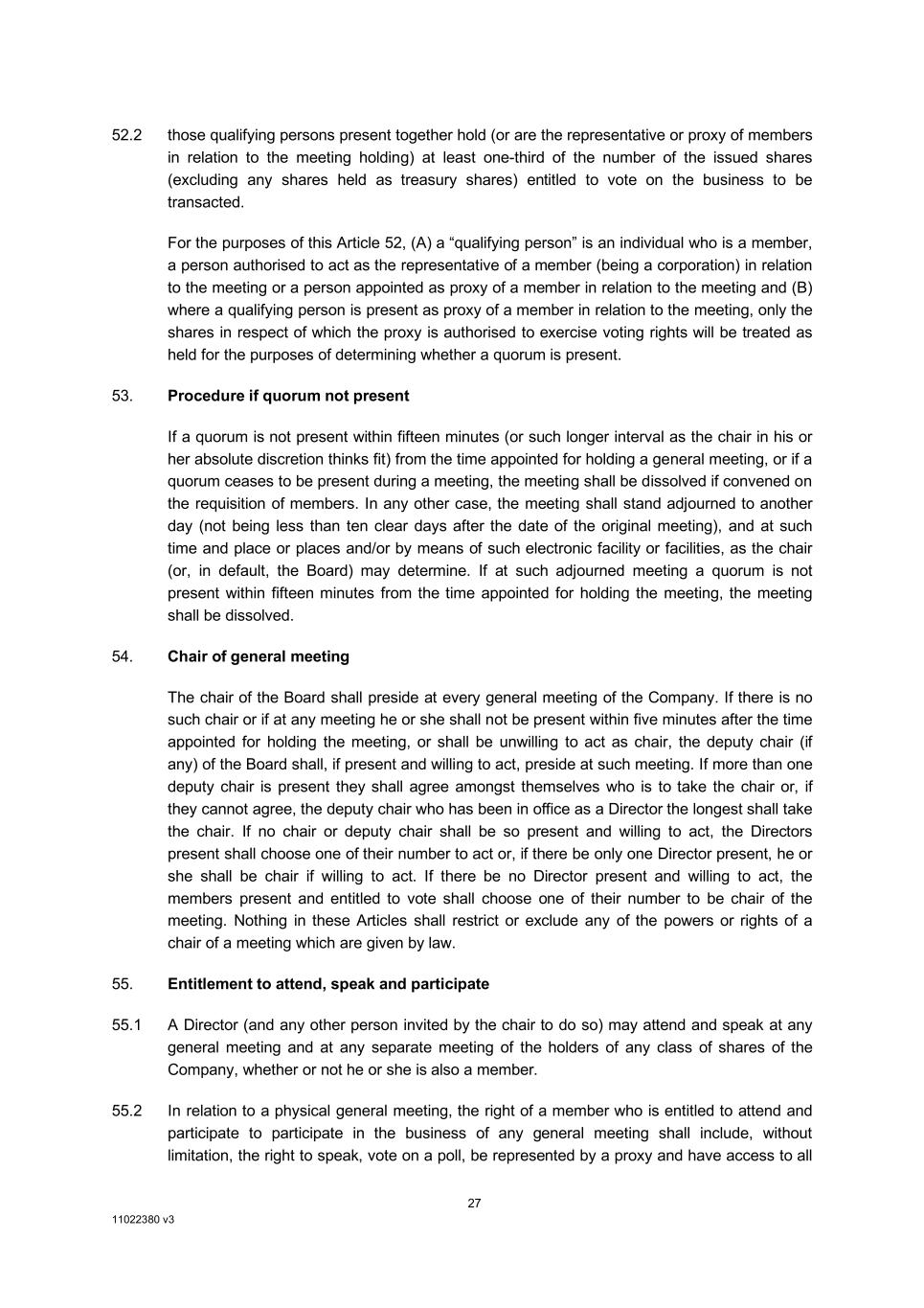 11022380 v3 27 52.2 those qualifying persons present together hold (or are the representative or proxy of members in relation to the meeting holding) at least one-third of the number of the issued shares (excluding any shares held as treasury shares) entitled to vote on the business to be transacted. For the purposes of this Article 52, (A) a “qualifying person” is an individual who is a member, a person authorised to act as the representative of a member (being a corporation) in relation to the meeting or a person appointed as proxy of a member in relation to the meeting and (B) where a qualifying person is present as proxy of a member in relation to the meeting, only the shares in respect of which the proxy is authorised to exercise voting rights will be treated as held for the purposes of determining whether a quorum is present. 53. Procedure if quorum not present If a quorum is not present within fifteen minutes (or such longer interval as the chair in his or her absolute discretion thinks fit) from the time appointed for holding a general meeting, or if a quorum ceases to be present during a meeting, the meeting shall be dissolved if convened on the requisition of members. In any other case, the meeting shall stand adjourned to another day (not being less than ten clear days after the date of the original meeting), and at such time and place or places and/or by means of such electronic facility or facilities, as the chair (or, in default, the Board) may determine. If at such adjourned meeting a quorum is not present within fifteen minutes from the time appointed for holding the meeting, the meeting shall be dissolved. 54. Chair of general meeting The chair of the Board shall preside at every general meeting of the Company. If there is no such chair or if at any meeting he or she shall not be present within five minutes after the time appointed for holding the meeting, or shall be unwilling to act as chair, the deputy chair (if any) of the Board shall, if present and willing to act, preside at such meeting. If more than one deputy chair is present they shall agree amongst themselves who is to take the chair or, if they cannot agree, the deputy chair who has been in office as a Director the longest shall take the chair. If no chair or deputy chair shall be so present and willing to act, the Directors present shall choose one of their number to act or, if there be only one Director present, he or she shall be chair if willing to act. If there be no Director present and willing to act, the members present and entitled to vote shall choose one of their number to be chair of the meeting. Nothing in these Articles shall restrict or exclude any of the powers or rights of a chair of a meeting which are given by law. 55. Entitlement to attend, speak and participate 55.1 A Director (and any other person invited by the chair to do so) may attend and speak at any general meeting and at any separate meeting of the holders of any class of shares of the Company, whether or not he or she is also a member. 55.2 In relation to a physical general meeting, the right of a member who is entitled to attend and participate to participate in the business of any general meeting shall include, without limitation, the right to speak, vote on a poll, be represented by a proxy and have access to all