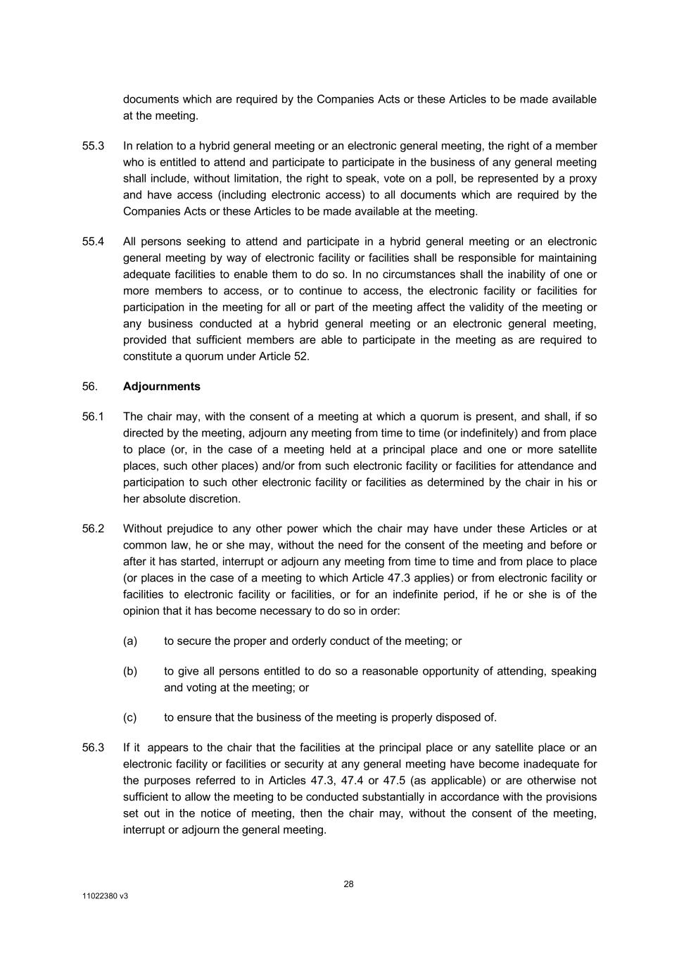11022380 v3 28 documents which are required by the Companies Acts or these Articles to be made available at the meeting. 55.3 In relation to a hybrid general meeting or an electronic general meeting, the right of a member who is entitled to attend and participate to participate in the business of any general meeting shall include, without limitation, the right to speak, vote on a poll, be represented by a proxy and have access (including electronic access) to all documents which are required by the Companies Acts or these Articles to be made available at the meeting. 55.4 All persons seeking to attend and participate in a hybrid general meeting or an electronic general meeting by way of electronic facility or facilities shall be responsible for maintaining adequate facilities to enable them to do so. In no circumstances shall the inability of one or more members to access, or to continue to access, the electronic facility or facilities for participation in the meeting for all or part of the meeting affect the validity of the meeting or any business conducted at a hybrid general meeting or an electronic general meeting, provided that sufficient members are able to participate in the meeting as are required to constitute a quorum under Article 52. 56. Adjournments 56.1 The chair may, with the consent of a meeting at which a quorum is present, and shall, if so directed by the meeting, adjourn any meeting from time to time (or indefinitely) and from place to place (or, in the case of a meeting held at a principal place and one or more satellite places, such other places) and/or from such electronic facility or facilities for attendance and participation to such other electronic facility or facilities as determined by the chair in his or her absolute discretion. 56.2 Without prejudice to any other power which the chair may have under these Articles or at common law, he or she may, without the need for the consent of the meeting and before or after it has started, interrupt or adjourn any meeting from time to time and from place to place (or places in the case of a meeting to which Article 47.3 applies) or from electronic facility or facilities to electronic facility or facilities, or for an indefinite period, if he or she is of the opinion that it has become necessary to do so in order: (a) to secure the proper and orderly conduct of the meeting; or (b) to give all persons entitled to do so a reasonable opportunity of attending, speaking and voting at the meeting; or (c) to ensure that the business of the meeting is properly disposed of. 56.3 If it appears to the chair that the facilities at the principal place or any satellite place or an electronic facility or facilities or security at any general meeting have become inadequate for the purposes referred to in Articles 47.3, 47.4 or 47.5 (as applicable) or are otherwise not sufficient to allow the meeting to be conducted substantially in accordance with the provisions set out in the notice of meeting, then the chair may, without the consent of the meeting, interrupt or adjourn the general meeting.