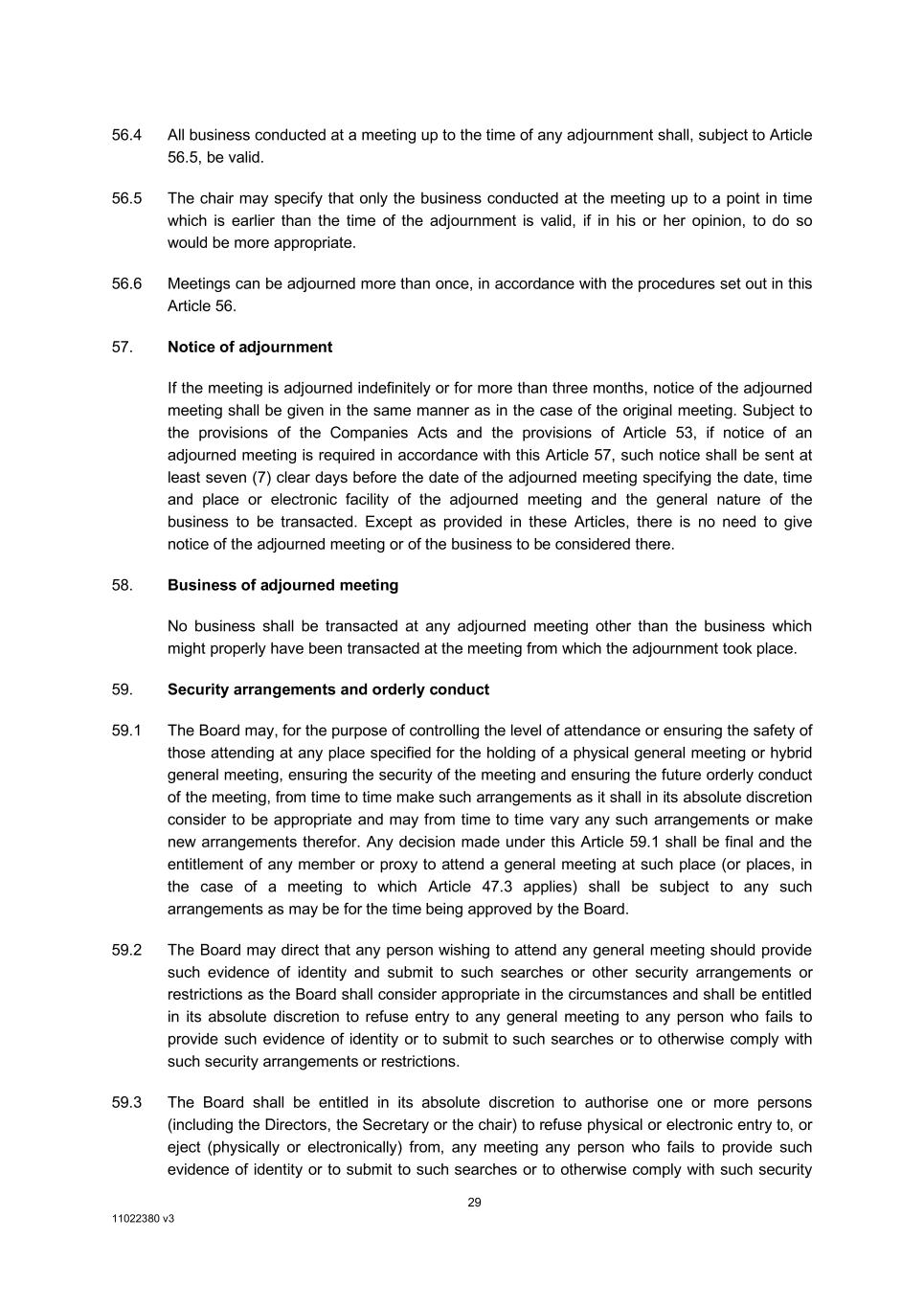 11022380 v3 29 56.4 All business conducted at a meeting up to the time of any adjournment shall, subject to Article 56.5, be valid. 56.5 The chair may specify that only the business conducted at the meeting up to a point in time which is earlier than the time of the adjournment is valid, if in his or her opinion, to do so would be more appropriate. 56.6 Meetings can be adjourned more than once, in accordance with the procedures set out in this Article 56. 57. Notice of adjournment If the meeting is adjourned indefinitely or for more than three months, notice of the adjourned meeting shall be given in the same manner as in the case of the original meeting. Subject to the provisions of the Companies Acts and the provisions of Article 53, if notice of an adjourned meeting is required in accordance with this Article 57, such notice shall be sent at least seven (7) clear days before the date of the adjourned meeting specifying the date, time and place or electronic facility of the adjourned meeting and the general nature of the business to be transacted. Except as provided in these Articles, there is no need to give notice of the adjourned meeting or of the business to be considered there. 58. Business of adjourned meeting No business shall be transacted at any adjourned meeting other than the business which might properly have been transacted at the meeting from which the adjournment took place. 59. Security arrangements and orderly conduct 59.1 The Board may, for the purpose of controlling the level of attendance or ensuring the safety of those attending at any place specified for the holding of a physical general meeting or hybrid general meeting, ensuring the security of the meeting and ensuring the future orderly conduct of the meeting, from time to time make such arrangements as it shall in its absolute discretion consider to be appropriate and may from time to time vary any such arrangements or make new arrangements therefor. Any decision made under this Article 59.1 shall be final and the entitlement of any member or proxy to attend a general meeting at such place (or places, in the case of a meeting to which Article 47.3 applies) shall be subject to any such arrangements as may be for the time being approved by the Board. 59.2 The Board may direct that any person wishing to attend any general meeting should provide such evidence of identity and submit to such searches or other security arrangements or restrictions as the Board shall consider appropriate in the circumstances and shall be entitled in its absolute discretion to refuse entry to any general meeting to any person who fails to provide such evidence of identity or to submit to such searches or to otherwise comply with such security arrangements or restrictions. 59.3 The Board shall be entitled in its absolute discretion to authorise one or more persons (including the Directors, the Secretary or the chair) to refuse physical or electronic entry to, or eject (physically or electronically) from, any meeting any person who fails to provide such evidence of identity or to submit to such searches or to otherwise comply with such security