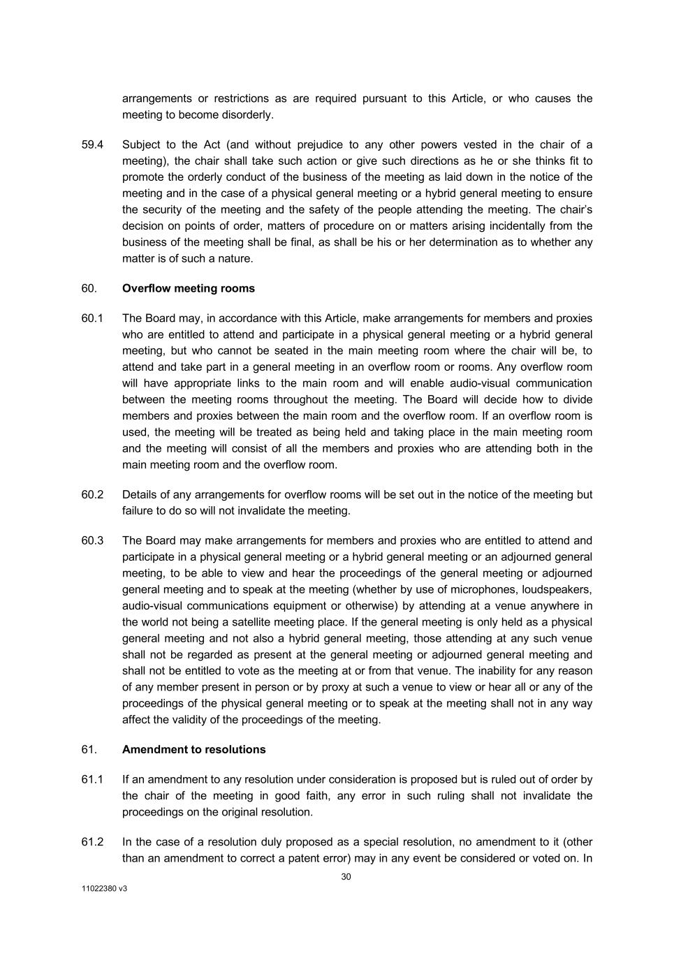 11022380 v3 30 arrangements or restrictions as are required pursuant to this Article, or who causes the meeting to become disorderly. 59.4 Subject to the Act (and without prejudice to any other powers vested in the chair of a meeting), the chair shall take such action or give such directions as he or she thinks fit to promote the orderly conduct of the business of the meeting as laid down in the notice of the meeting and in the case of a physical general meeting or a hybrid general meeting to ensure the security of the meeting and the safety of the people attending the meeting. The chair’s decision on points of order, matters of procedure on or matters arising incidentally from the business of the meeting shall be final, as shall be his or her determination as to whether any matter is of such a nature. 60. Overflow meeting rooms 60.1 The Board may, in accordance with this Article, make arrangements for members and proxies who are entitled to attend and participate in a physical general meeting or a hybrid general meeting, but who cannot be seated in the main meeting room where the chair will be, to attend and take part in a general meeting in an overflow room or rooms. Any overflow room will have appropriate links to the main room and will enable audio-visual communication between the meeting rooms throughout the meeting. The Board will decide how to divide members and proxies between the main room and the overflow room. If an overflow room is used, the meeting will be treated as being held and taking place in the main meeting room and the meeting will consist of all the members and proxies who are attending both in the main meeting room and the overflow room. 60.2 Details of any arrangements for overflow rooms will be set out in the notice of the meeting but failure to do so will not invalidate the meeting. 60.3 The Board may make arrangements for members and proxies who are entitled to attend and participate in a physical general meeting or a hybrid general meeting or an adjourned general meeting, to be able to view and hear the proceedings of the general meeting or adjourned general meeting and to speak at the meeting (whether by use of microphones, loudspeakers, audio-visual communications equipment or otherwise) by attending at a venue anywhere in the world not being a satellite meeting place. If the general meeting is only held as a physical general meeting and not also a hybrid general meeting, those attending at any such venue shall not be regarded as present at the general meeting or adjourned general meeting and shall not be entitled to vote as the meeting at or from that venue. The inability for any reason of any member present in person or by proxy at such a venue to view or hear all or any of the proceedings of the physical general meeting or to speak at the meeting shall not in any way affect the validity of the proceedings of the meeting. 61. Amendment to resolutions 61.1 If an amendment to any resolution under consideration is proposed but is ruled out of order by the chair of the meeting in good faith, any error in such ruling shall not invalidate the proceedings on the original resolution. 61.2 In the case of a resolution duly proposed as a special resolution, no amendment to it (other than an amendment to correct a patent error) may in any event be considered or voted on. In