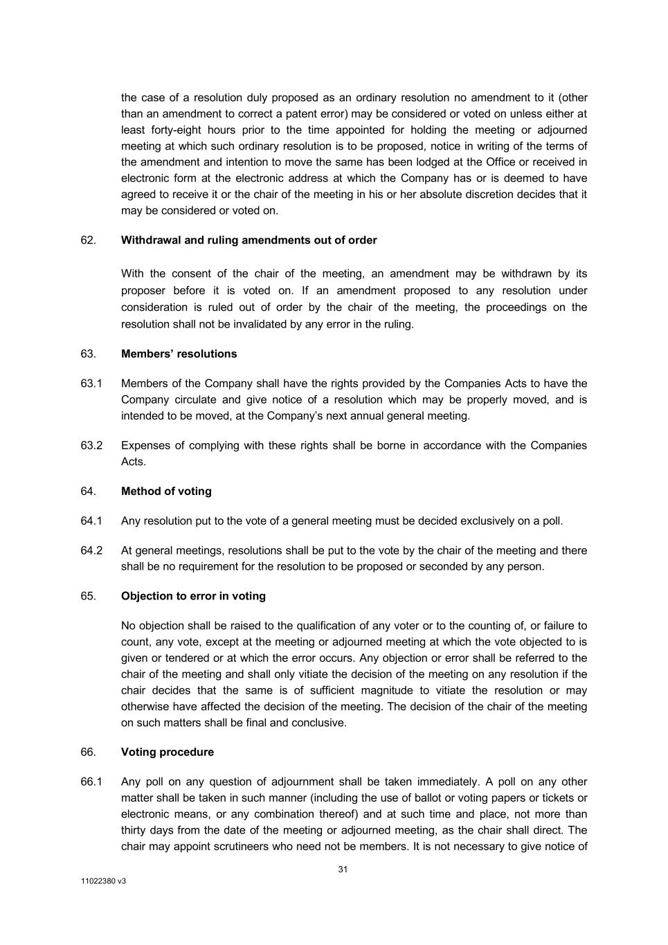 11022380 v3 31 the case of a resolution duly proposed as an ordinary resolution no amendment to it (other than an amendment to correct a patent error) may be considered or voted on unless either at least forty-eight hours prior to the time appointed for holding the meeting or adjourned meeting at which such ordinary resolution is to be proposed, notice in writing of the terms of the amendment and intention to move the same has been lodged at the Office or received in electronic form at the electronic address at which the Company has or is deemed to have agreed to receive it or the chair of the meeting in his or her absolute discretion decides that it may be considered or voted on. 62. Withdrawal and ruling amendments out of order With the consent of the chair of the meeting, an amendment may be withdrawn by its proposer before it is voted on. If an amendment proposed to any resolution under consideration is ruled out of order by the chair of the meeting, the proceedings on the resolution shall not be invalidated by any error in the ruling. 63. Members’ resolutions 63.1 Members of the Company shall have the rights provided by the Companies Acts to have the Company circulate and give notice of a resolution which may be properly moved, and is intended to be moved, at the Company’s next annual general meeting. 63.2 Expenses of complying with these rights shall be borne in accordance with the Companies Acts. 64. Method of voting 64.1 Any resolution put to the vote of a general meeting must be decided exclusively on a poll. 64.2 At general meetings, resolutions shall be put to the vote by the chair of the meeting and there shall be no requirement for the resolution to be proposed or seconded by any person. 65. Objection to error in voting No objection shall be raised to the qualification of any voter or to the counting of, or failure to count, any vote, except at the meeting or adjourned meeting at which the vote objected to is given or tendered or at which the error occurs. Any objection or error shall be referred to the chair of the meeting and shall only vitiate the decision of the meeting on any resolution if the chair decides that the same is of sufficient magnitude to vitiate the resolution or may otherwise have affected the decision of the meeting. The decision of the chair of the meeting on such matters shall be final and conclusive. 66. Voting procedure 66.1 Any poll on any question of adjournment shall be taken immediately. A poll on any other matter shall be taken in such manner (including the use of ballot or voting papers or tickets or electronic means, or any combination thereof) and at such time and place, not more than thirty days from the date of the meeting or adjourned meeting, as the chair shall direct. The chair may appoint scrutineers who need not be members. It is not necessary to give notice of