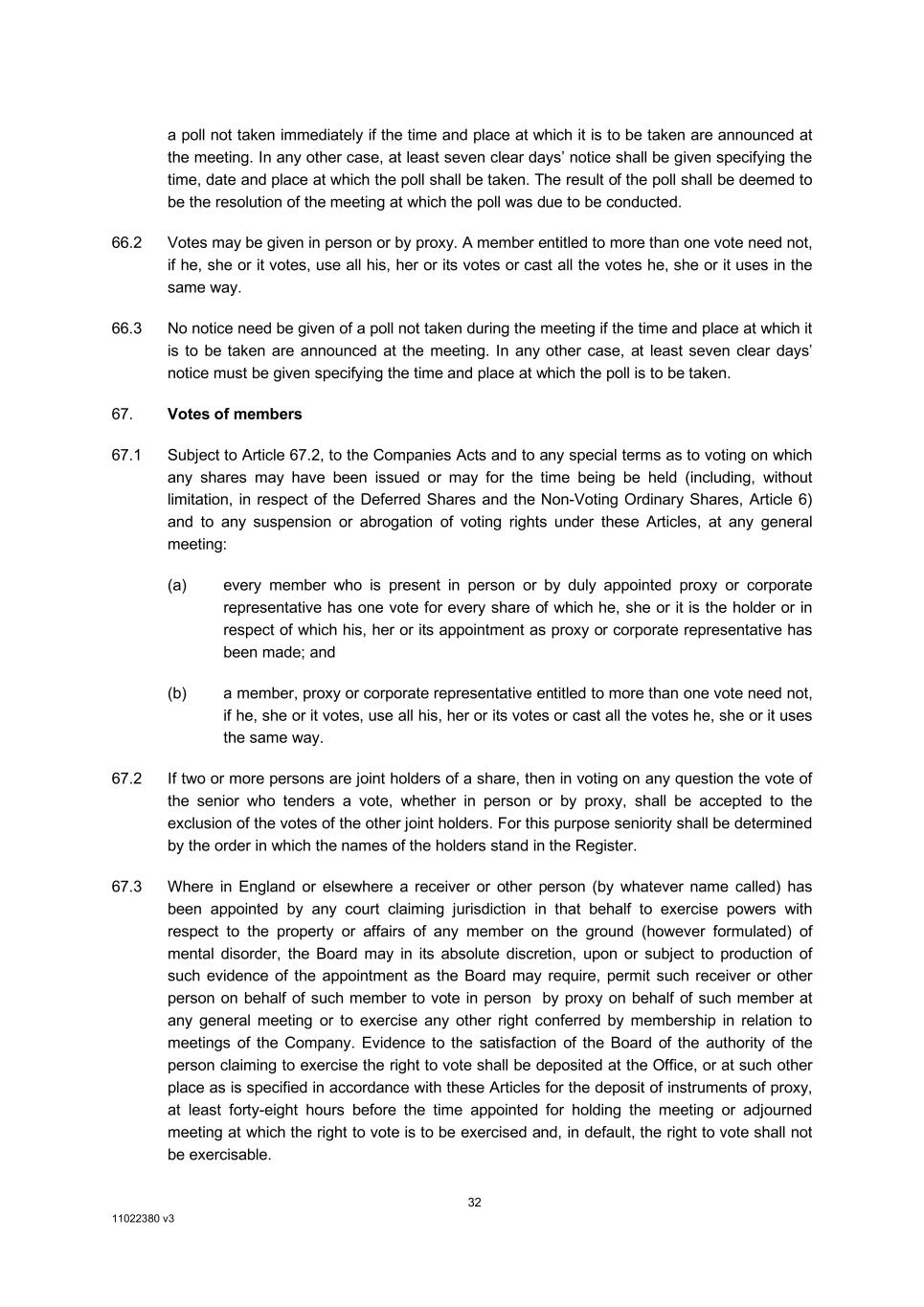 11022380 v3 32 a poll not taken immediately if the time and place at which it is to be taken are announced at the meeting. In any other case, at least seven clear days’ notice shall be given specifying the time, date and place at which the poll shall be taken. The result of the poll shall be deemed to be the resolution of the meeting at which the poll was due to be conducted. 66.2 Votes may be given in person or by proxy. A member entitled to more than one vote need not, if he, she or it votes, use all his, her or its votes or cast all the votes he, she or it uses in the same way. 66.3 No notice need be given of a poll not taken during the meeting if the time and place at which it is to be taken are announced at the meeting. In any other case, at least seven clear days’ notice must be given specifying the time and place at which the poll is to be taken. 67. Votes of members 67.1 Subject to Article 67.2, to the Companies Acts and to any special terms as to voting on which any shares may have been issued or may for the time being be held (including, without limitation, in respect of the Deferred Shares and the Non-Voting Ordinary Shares, Article 6) and to any suspension or abrogation of voting rights under these Articles, at any general meeting: (a) every member who is present in person or by duly appointed proxy or corporate representative has one vote for every share of which he, she or it is the holder or in respect of which his, her or its appointment as proxy or corporate representative has been made; and (b) a member, proxy or corporate representative entitled to more than one vote need not, if he, she or it votes, use all his, her or its votes or cast all the votes he, she or it uses the same way. 67.2 If two or more persons are joint holders of a share, then in voting on any question the vote of the senior who tenders a vote, whether in person or by proxy, shall be accepted to the exclusion of the votes of the other joint holders. For this purpose seniority shall be determined by the order in which the names of the holders stand in the Register. 67.3 Where in England or elsewhere a receiver or other person (by whatever name called) has been appointed by any court claiming jurisdiction in that behalf to exercise powers with respect to the property or affairs of any member on the ground (however formulated) of mental disorder, the Board may in its absolute discretion, upon or subject to production of such evidence of the appointment as the Board may require, permit such receiver or other person on behalf of such member to vote in person by proxy on behalf of such member at any general meeting or to exercise any other right conferred by membership in relation to meetings of the Company. Evidence to the satisfaction of the Board of the authority of the person claiming to exercise the right to vote shall be deposited at the Office, or at such other place as is specified in accordance with these Articles for the deposit of instruments of proxy, at least forty-eight hours before the time appointed for holding the meeting or adjourned meeting at which the right to vote is to be exercised and, in default, the right to vote shall not be exercisable.