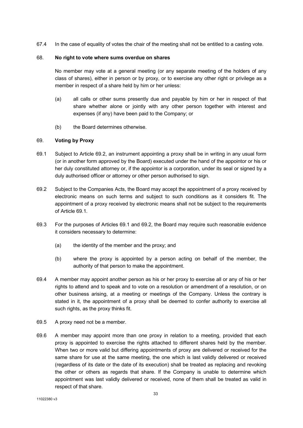 11022380 v3 33 67.4 In the case of equality of votes the chair of the meeting shall not be entitled to a casting vote. 68. No right to vote where sums overdue on shares No member may vote at a general meeting (or any separate meeting of the holders of any class of shares), either in person or by proxy, or to exercise any other right or privilege as a member in respect of a share held by him or her unless: (a) all calls or other sums presently due and payable by him or her in respect of that share whether alone or jointly with any other person together with interest and expenses (if any) have been paid to the Company; or (b) the Board determines otherwise. 69. Voting by Proxy 69.1 Subject to Article 69.2, an instrument appointing a proxy shall be in writing in any usual form (or in another form approved by the Board) executed under the hand of the appointor or his or her duly constituted attorney or, if the appointor is a corporation, under its seal or signed by a duly authorised officer or attorney or other person authorised to sign. 69.2 Subject to the Companies Acts, the Board may accept the appointment of a proxy received by electronic means on such terms and subject to such conditions as it considers fit. The appointment of a proxy received by electronic means shall not be subject to the requirements of Article 69.1. 69.3 For the purposes of Articles 69.1 and 69.2, the Board may require such reasonable evidence it considers necessary to determine: (a) the identity of the member and the proxy; and (b) where the proxy is appointed by a person acting on behalf of the member, the authority of that person to make the appointment. 69.4 A member may appoint another person as his or her proxy to exercise all or any of his or her rights to attend and to speak and to vote on a resolution or amendment of a resolution, or on other business arising, at a meeting or meetings of the Company. Unless the contrary is stated in it, the appointment of a proxy shall be deemed to confer authority to exercise all such rights, as the proxy thinks fit. 69.5 A proxy need not be a member. 69.6 A member may appoint more than one proxy in relation to a meeting, provided that each proxy is appointed to exercise the rights attached to different shares held by the member. When two or more valid but differing appointments of proxy are delivered or received for the same share for use at the same meeting, the one which is last validly delivered or received (regardless of its date or the date of its execution) shall be treated as replacing and revoking the other or others as regards that share. If the Company is unable to determine which appointment was last validly delivered or received, none of them shall be treated as valid in respect of that share.