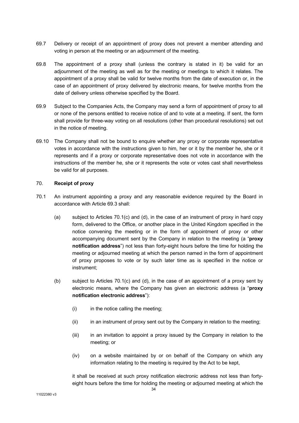 11022380 v3 34 69.7 Delivery or receipt of an appointment of proxy does not prevent a member attending and voting in person at the meeting or an adjournment of the meeting. 69.8 The appointment of a proxy shall (unless the contrary is stated in it) be valid for an adjournment of the meeting as well as for the meeting or meetings to which it relates. The appointment of a proxy shall be valid for twelve months from the date of execution or, in the case of an appointment of proxy delivered by electronic means, for twelve months from the date of delivery unless otherwise specified by the Board. 69.9 Subject to the Companies Acts, the Company may send a form of appointment of proxy to all or none of the persons entitled to receive notice of and to vote at a meeting. If sent, the form shall provide for three-way voting on all resolutions (other than procedural resolutions) set out in the notice of meeting. 69.10 The Company shall not be bound to enquire whether any proxy or corporate representative votes in accordance with the instructions given to him, her or it by the member he, she or it represents and if a proxy or corporate representative does not vote in accordance with the instructions of the member he, she or it represents the vote or votes cast shall nevertheless be valid for all purposes. 70. Receipt of proxy 70.1 An instrument appointing a proxy and any reasonable evidence required by the Board in accordance with Article 69.3 shall: (a) subject to Articles 70.1(c) and (d), in the case of an instrument of proxy in hard copy form, delivered to the Office, or another place in the United Kingdom specified in the notice convening the meeting or in the form of appointment of proxy or other accompanying document sent by the Company in relation to the meeting (a “proxy notification address”) not less than forty-eight hours before the time for holding the meeting or adjourned meeting at which the person named in the form of appointment of proxy proposes to vote or by such later time as is specified in the notice or instrument; (b) subject to Articles 70.1(c) and (d), in the case of an appointment of a proxy sent by electronic means, where the Company has given an electronic address (a “proxy notification electronic address”): (i) in the notice calling the meeting; (ii) in an instrument of proxy sent out by the Company in relation to the meeting; (iii) in an invitation to appoint a proxy issued by the Company in relation to the meeting; or (iv) on a website maintained by or on behalf of the Company on which any information relating to the meeting is required by the Act to be kept, it shall be received at such proxy notification electronic address not less than forty- eight hours before the time for holding the meeting or adjourned meeting at which the