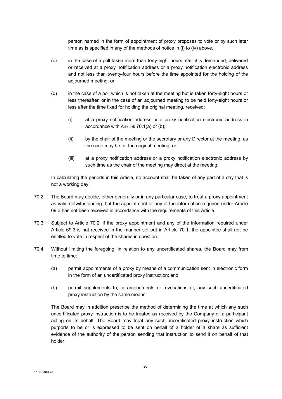 11022380 v3 35 person named in the form of appointment of proxy proposes to vote or by such later time as is specified in any of the methods of notice in (i) to (iv) above. (c) in the case of a poll taken more than forty-eight hours after it is demanded, delivered or received at a proxy notification address or a proxy notification electronic address and not less than twenty-four hours before the time appointed for the holding of the adjourned meeting; or (d) in the case of a poll which is not taken at the meeting but is taken forty-eight hours or less thereafter, or in the case of an adjourned meeting to be held forty-eight hours or less after the time fixed for holding the original meeting, received: (i) at a proxy notification address or a proxy notification electronic address in accordance with Articles 70.1(a) or (b); (ii) by the chair of the meeting or the secretary or any Director at the meeting, as the case may be, at the original meeting; or (iii) at a proxy notification address or a proxy notification electronic address by such time as the chair of the meeting may direct at the meeting. In calculating the periods in this Article, no account shall be taken of any part of a day that is not a working day. 70.2 The Board may decide, either generally or in any particular case, to treat a proxy appointment as valid notwithstanding that the appointment or any of the information required under Article 69.3 has not been received in accordance with the requirements of this Article. 70.3 Subject to Article 70.2, if the proxy appointment and any of the information required under Article 69.3 is not received in the manner set out in Article 70.1, the appointee shall not be entitled to vote in respect of the shares in question. 70.4 Without limiting the foregoing, in relation to any uncertificated shares, the Board may from time to time: (a) permit appointments of a proxy by means of a communication sent in electronic form in the form of an uncertificated proxy instruction; and (b) permit supplements to, or amendments or revocations of, any such uncertificated proxy instruction by the same means. The Board may in addition prescribe the method of determining the time at which any such uncertificated proxy instruction is to be treated as received by the Company or a participant acting on its behalf. The Board may treat any such uncertificated proxy instruction which purports to be or is expressed to be sent on behalf of a holder of a share as sufficient evidence of the authority of the person sending that instruction to send it on behalf of that holder.