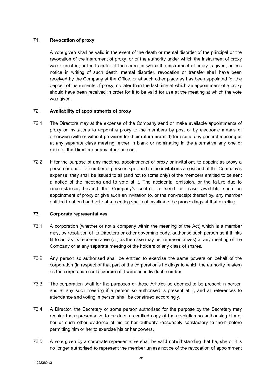 11022380 v3 36 71. Revocation of proxy A vote given shall be valid in the event of the death or mental disorder of the principal or the revocation of the instrument of proxy, or of the authority under which the instrument of proxy was executed, or the transfer of the share for which the instrument of proxy is given, unless notice in writing of such death, mental disorder, revocation or transfer shall have been received by the Company at the Office, or at such other place as has been appointed for the deposit of instruments of proxy, no later than the last time at which an appointment of a proxy should have been received in order for it to be valid for use at the meeting at which the vote was given. 72. Availability of appointments of proxy 72.1 The Directors may at the expense of the Company send or make available appointments of proxy or invitations to appoint a proxy to the members by post or by electronic means or otherwise (with or without provision for their return prepaid) for use at any general meeting or at any separate class meeting, either in blank or nominating in the alternative any one or more of the Directors or any other person. 72.2 If for the purpose of any meeting, appointments of proxy or invitations to appoint as proxy a person or one of a number of persons specified in the invitations are issued at the Company’s expense, they shall be issued to all (and not to some only) of the members entitled to be sent a notice of the meeting and to vote at it. The accidental omission, or the failure due to circumstances beyond the Company’s control, to send or make available such an appointment of proxy or give such an invitation to, or the non-receipt thereof by, any member entitled to attend and vote at a meeting shall not invalidate the proceedings at that meeting. 73. Corporate representatives 73.1 A corporation (whether or not a company within the meaning of the Act) which is a member may, by resolution of its Directors or other governing body, authorise such person as it thinks fit to act as its representative (or, as the case may be, representatives) at any meeting of the Company or at any separate meeting of the holders of any class of shares. 73.2 Any person so authorised shall be entitled to exercise the same powers on behalf of the corporation (in respect of that part of the corporation’s holdings to which the authority relates) as the corporation could exercise if it were an individual member. 73.3 The corporation shall for the purposes of these Articles be deemed to be present in person and at any such meeting if a person so authorised is present at it, and all references to attendance and voting in person shall be construed accordingly. 73.4 A Director, the Secretary or some person authorised for the purpose by the Secretary may require the representative to produce a certified copy of the resolution so authorising him or her or such other evidence of his or her authority reasonably satisfactory to them before permitting him or her to exercise his or her powers. 73.5 A vote given by a corporate representative shall be valid notwithstanding that he, she or it is no longer authorised to represent the member unless notice of the revocation of appointment