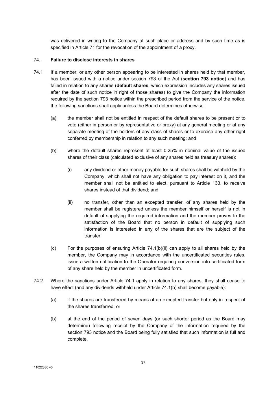 11022380 v3 37 was delivered in writing to the Company at such place or address and by such time as is specified in Article 71 for the revocation of the appointment of a proxy. 74. Failure to disclose interests in shares 74.1 If a member, or any other person appearing to be interested in shares held by that member, has been issued with a notice under section 793 of the Act (section 793 notice) and has failed in relation to any shares (default shares, which expression includes any shares issued after the date of such notice in right of those shares) to give the Company the information required by the section 793 notice within the prescribed period from the service of the notice, the following sanctions shall apply unless the Board determines otherwise: (a) the member shall not be entitled in respect of the default shares to be present or to vote (either in person or by representative or proxy) at any general meeting or at any separate meeting of the holders of any class of shares or to exercise any other right conferred by membership in relation to any such meeting; and (b) where the default shares represent at least 0.25% in nominal value of the issued shares of their class (calculated exclusive of any shares held as treasury shares): (i) any dividend or other money payable for such shares shall be withheld by the Company, which shall not have any obligation to pay interest on it, and the member shall not be entitled to elect, pursuant to Article 133, to receive shares instead of that dividend; and (ii) no transfer, other than an excepted transfer, of any shares held by the member shall be registered unless the member himself or herself is not in default of supplying the required information and the member proves to the satisfaction of the Board that no person in default of supplying such information is interested in any of the shares that are the subject of the transfer. (c) For the purposes of ensuring Article 74.1(b)(ii) can apply to all shares held by the member, the Company may in accordance with the uncertificated securities rules, issue a written notification to the Operator requiring conversion into certificated form of any share held by the member in uncertificated form. 74.2 Where the sanctions under Article 74.1 apply in relation to any shares, they shall cease to have effect (and any dividends withheld under Article 74.1(b) shall become payable): (a) if the shares are transferred by means of an excepted transfer but only in respect of the shares transferred; or (b) at the end of the period of seven days (or such shorter period as the Board may determine) following receipt by the Company of the information required by the section 793 notice and the Board being fully satisfied that such information is full and complete.