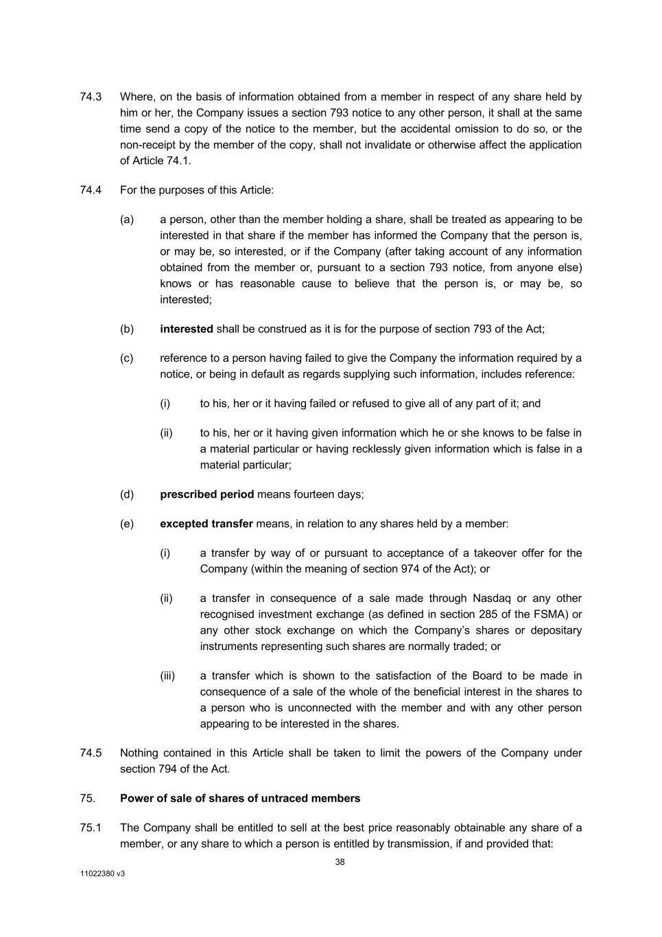 11022380 v3 38 74.3 Where, on the basis of information obtained from a member in respect of any share held by him or her, the Company issues a section 793 notice to any other person, it shall at the same time send a copy of the notice to the member, but the accidental omission to do so, or the non-receipt by the member of the copy, shall not invalidate or otherwise affect the application of Article 74.1. 74.4 For the purposes of this Article: (a) a person, other than the member holding a share, shall be treated as appearing to be interested in that share if the member has informed the Company that the person is, or may be, so interested, or if the Company (after taking account of any information obtained from the member or, pursuant to a section 793 notice, from anyone else) knows or has reasonable cause to believe that the person is, or may be, so interested; (b) interested shall be construed as it is for the purpose of section 793 of the Act; (c) reference to a person having failed to give the Company the information required by a notice, or being in default as regards supplying such information, includes reference: (i) to his, her or it having failed or refused to give all of any part of it; and (ii) to his, her or it having given information which he or she knows to be false in a material particular or having recklessly given information which is false in a material particular; (d) prescribed period means fourteen days; (e) excepted transfer means, in relation to any shares held by a member: (i) a transfer by way of or pursuant to acceptance of a takeover offer for the Company (within the meaning of section 974 of the Act); or (ii) a transfer in consequence of a sale made through Nasdaq or any other recognised investment exchange (as defined in section 285 of the FSMA) or any other stock exchange on which the Company’s shares or depositary instruments representing such shares are normally traded; or (iii) a transfer which is shown to the satisfaction of the Board to be made in consequence of a sale of the whole of the beneficial interest in the shares to a person who is unconnected with the member and with any other person appearing to be interested in the shares. 74.5 Nothing contained in this Article shall be taken to limit the powers of the Company under section 794 of the Act. 75. Power of sale of shares of untraced members 75.1 The Company shall be entitled to sell at the best price reasonably obtainable any share of a member, or any share to which a person is entitled by transmission, if and provided that: