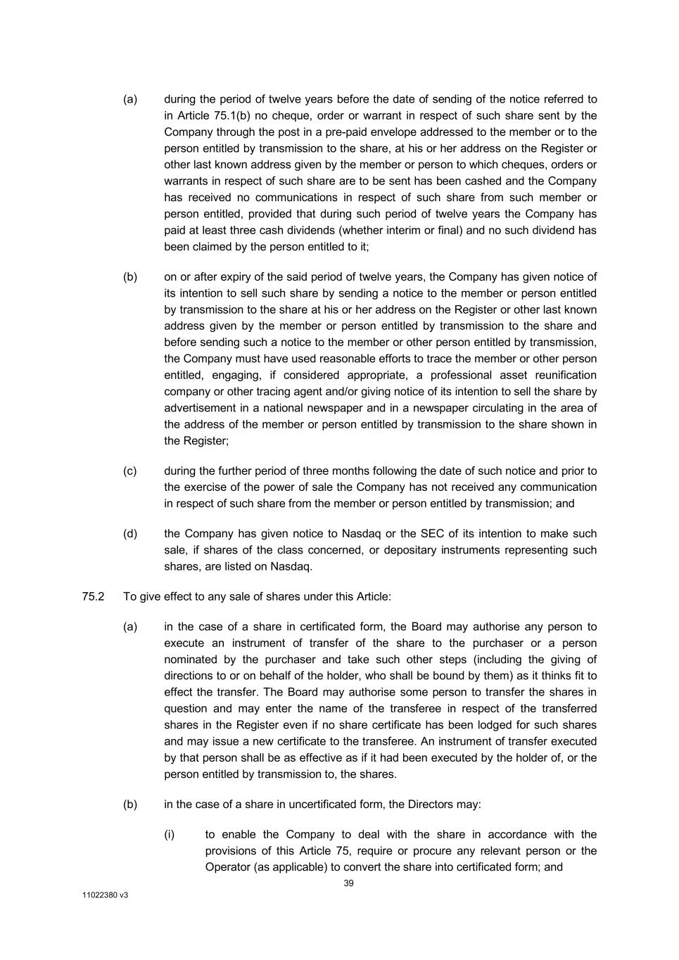 11022380 v3 39 (a) during the period of twelve years before the date of sending of the notice referred to in Article 75.1(b) no cheque, order or warrant in respect of such share sent by the Company through the post in a pre-paid envelope addressed to the member or to the person entitled by transmission to the share, at his or her address on the Register or other last known address given by the member or person to which cheques, orders or warrants in respect of such share are to be sent has been cashed and the Company has received no communications in respect of such share from such member or person entitled, provided that during such period of twelve years the Company has paid at least three cash dividends (whether interim or final) and no such dividend has been claimed by the person entitled to it; (b) on or after expiry of the said period of twelve years, the Company has given notice of its intention to sell such share by sending a notice to the member or person entitled by transmission to the share at his or her address on the Register or other last known address given by the member or person entitled by transmission to the share and before sending such a notice to the member or other person entitled by transmission, the Company must have used reasonable efforts to trace the member or other person entitled, engaging, if considered appropriate, a professional asset reunification company or other tracing agent and/or giving notice of its intention to sell the share by advertisement in a national newspaper and in a newspaper circulating in the area of the address of the member or person entitled by transmission to the share shown in the Register; (c) during the further period of three months following the date of such notice and prior to the exercise of the power of sale the Company has not received any communication in respect of such share from the member or person entitled by transmission; and (d) the Company has given notice to Nasdaq or the SEC of its intention to make such sale, if shares of the class concerned, or depositary instruments representing such shares, are listed on Nasdaq. 75.2 To give effect to any sale of shares under this Article: (a) in the case of a share in certificated form, the Board may authorise any person to execute an instrument of transfer of the share to the purchaser or a person nominated by the purchaser and take such other steps (including the giving of directions to or on behalf of the holder, who shall be bound by them) as it thinks fit to effect the transfer. The Board may authorise some person to transfer the shares in question and may enter the name of the transferee in respect of the transferred shares in the Register even if no share certificate has been lodged for such shares and may issue a new certificate to the transferee. An instrument of transfer executed by that person shall be as effective as if it had been executed by the holder of, or the person entitled by transmission to, the shares. (b) in the case of a share in uncertificated form, the Directors may: (i) to enable the Company to deal with the share in accordance with the provisions of this Article 75, require or procure any relevant person or the Operator (as applicable) to convert the share into certificated form; and