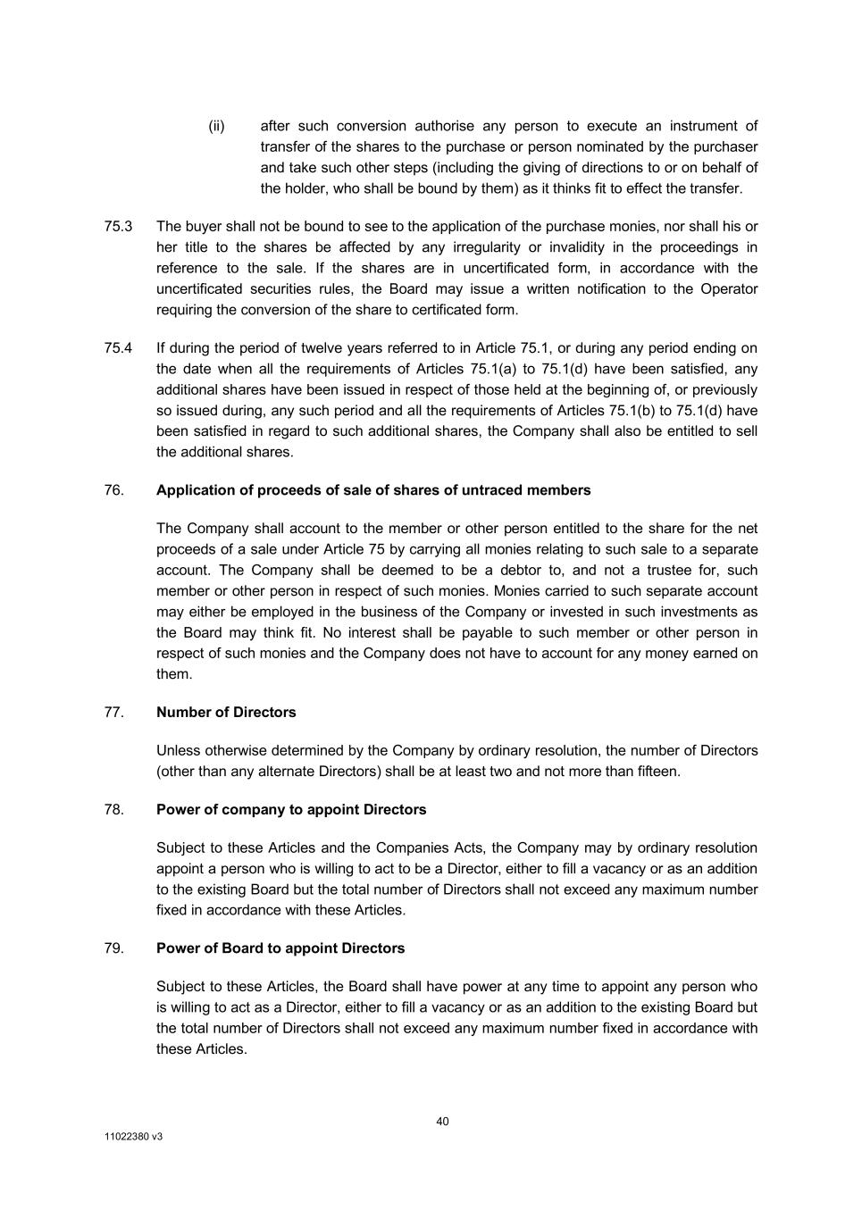11022380 v3 40 (ii) after such conversion authorise any person to execute an instrument of transfer of the shares to the purchase or person nominated by the purchaser and take such other steps (including the giving of directions to or on behalf of the holder, who shall be bound by them) as it thinks fit to effect the transfer. 75.3 The buyer shall not be bound to see to the application of the purchase monies, nor shall his or her title to the shares be affected by any irregularity or invalidity in the proceedings in reference to the sale. If the shares are in uncertificated form, in accordance with the uncertificated securities rules, the Board may issue a written notification to the Operator requiring the conversion of the share to certificated form. 75.4 If during the period of twelve years referred to in Article 75.1, or during any period ending on the date when all the requirements of Articles 75.1(a) to 75.1(d) have been satisfied, any additional shares have been issued in respect of those held at the beginning of, or previously so issued during, any such period and all the requirements of Articles 75.1(b) to 75.1(d) have been satisfied in regard to such additional shares, the Company shall also be entitled to sell the additional shares. 76. Application of proceeds of sale of shares of untraced members The Company shall account to the member or other person entitled to the share for the net proceeds of a sale under Article 75 by carrying all monies relating to such sale to a separate account. The Company shall be deemed to be a debtor to, and not a trustee for, such member or other person in respect of such monies. Monies carried to such separate account may either be employed in the business of the Company or invested in such investments as the Board may think fit. No interest shall be payable to such member or other person in respect of such monies and the Company does not have to account for any money earned on them. 77. Number of Directors Unless otherwise determined by the Company by ordinary resolution, the number of Directors (other than any alternate Directors) shall be at least two and not more than fifteen. 78. Power of company to appoint Directors Subject to these Articles and the Companies Acts, the Company may by ordinary resolution appoint a person who is willing to act to be a Director, either to fill a vacancy or as an addition to the existing Board but the total number of Directors shall not exceed any maximum number fixed in accordance with these Articles. 79. Power of Board to appoint Directors Subject to these Articles, the Board shall have power at any time to appoint any person who is willing to act as a Director, either to fill a vacancy or as an addition to the existing Board but the total number of Directors shall not exceed any maximum number fixed in accordance with these Articles.