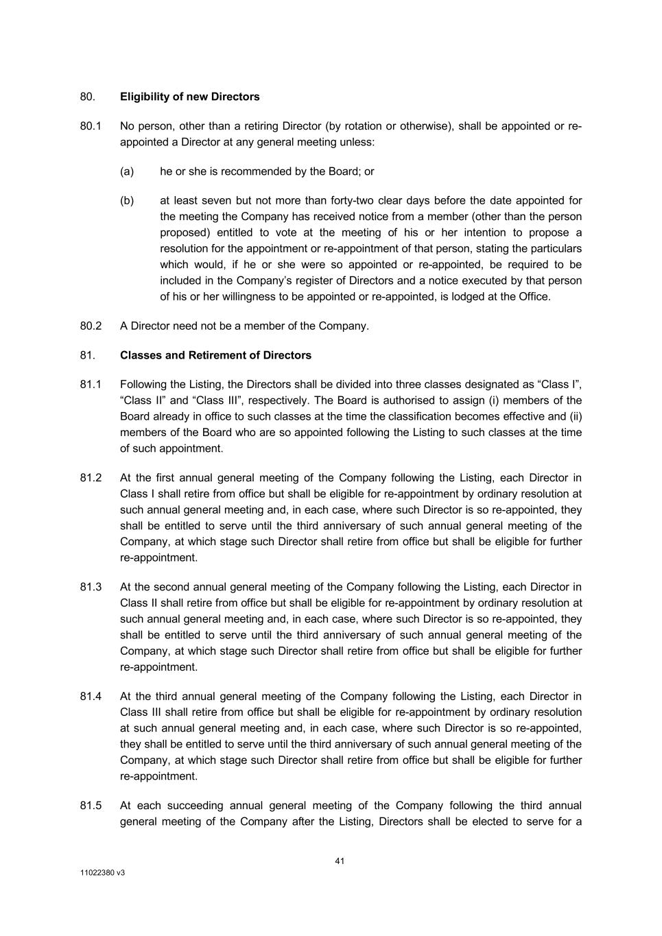 11022380 v3 41 80. Eligibility of new Directors 80.1 No person, other than a retiring Director (by rotation or otherwise), shall be appointed or re- appointed a Director at any general meeting unless: (a) he or she is recommended by the Board; or (b) at least seven but not more than forty-two clear days before the date appointed for the meeting the Company has received notice from a member (other than the person proposed) entitled to vote at the meeting of his or her intention to propose a resolution for the appointment or re-appointment of that person, stating the particulars which would, if he or she were so appointed or re-appointed, be required to be included in the Company’s register of Directors and a notice executed by that person of his or her willingness to be appointed or re-appointed, is lodged at the Office. 80.2 A Director need not be a member of the Company. 81. Classes and Retirement of Directors 81.1 Following the Listing, the Directors shall be divided into three classes designated as “Class I”, “Class II” and “Class III”, respectively. The Board is authorised to assign (i) members of the Board already in office to such classes at the time the classification becomes effective and (ii) members of the Board who are so appointed following the Listing to such classes at the time of such appointment. 81.2 At the first annual general meeting of the Company following the Listing, each Director in Class I shall retire from office but shall be eligible for re-appointment by ordinary resolution at such annual general meeting and, in each case, where such Director is so re-appointed, they shall be entitled to serve until the third anniversary of such annual general meeting of the Company, at which stage such Director shall retire from office but shall be eligible for further re-appointment. 81.3 At the second annual general meeting of the Company following the Listing, each Director in Class II shall retire from office but shall be eligible for re-appointment by ordinary resolution at such annual general meeting and, in each case, where such Director is so re-appointed, they shall be entitled to serve until the third anniversary of such annual general meeting of the Company, at which stage such Director shall retire from office but shall be eligible for further re-appointment. 81.4 At the third annual general meeting of the Company following the Listing, each Director in Class III shall retire from office but shall be eligible for re-appointment by ordinary resolution at such annual general meeting and, in each case, where such Director is so re-appointed, they shall be entitled to serve until the third anniversary of such annual general meeting of the Company, at which stage such Director shall retire from office but shall be eligible for further re-appointment. 81.5 At each succeeding annual general meeting of the Company following the third annual general meeting of the Company after the Listing, Directors shall be elected to serve for a