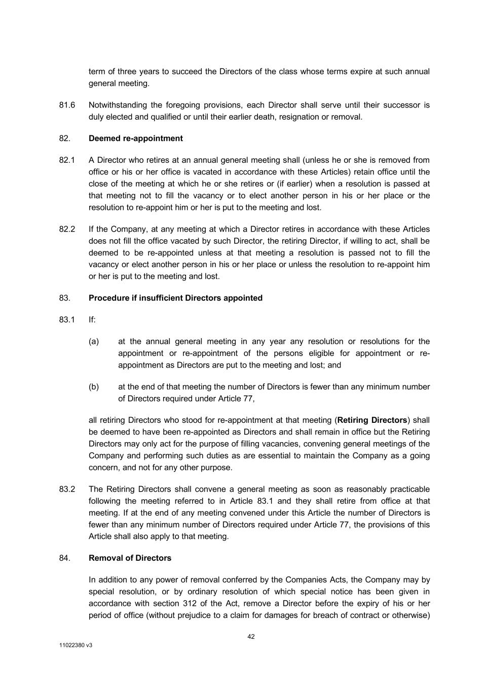 11022380 v3 42 term of three years to succeed the Directors of the class whose terms expire at such annual general meeting. 81.6 Notwithstanding the foregoing provisions, each Director shall serve until their successor is duly elected and qualified or until their earlier death, resignation or removal. 82. Deemed re-appointment 82.1 A Director who retires at an annual general meeting shall (unless he or she is removed from office or his or her office is vacated in accordance with these Articles) retain office until the close of the meeting at which he or she retires or (if earlier) when a resolution is passed at that meeting not to fill the vacancy or to elect another person in his or her place or the resolution to re-appoint him or her is put to the meeting and lost. 82.2 If the Company, at any meeting at which a Director retires in accordance with these Articles does not fill the office vacated by such Director, the retiring Director, if willing to act, shall be deemed to be re-appointed unless at that meeting a resolution is passed not to fill the vacancy or elect another person in his or her place or unless the resolution to re-appoint him or her is put to the meeting and lost. 83. Procedure if insufficient Directors appointed 83.1 If: (a) at the annual general meeting in any year any resolution or resolutions for the appointment or re-appointment of the persons eligible for appointment or re- appointment as Directors are put to the meeting and lost; and (b) at the end of that meeting the number of Directors is fewer than any minimum number of Directors required under Article 77, all retiring Directors who stood for re-appointment at that meeting (Retiring Directors) shall be deemed to have been re-appointed as Directors and shall remain in office but the Retiring Directors may only act for the purpose of filling vacancies, convening general meetings of the Company and performing such duties as are essential to maintain the Company as a going concern, and not for any other purpose. 83.2 The Retiring Directors shall convene a general meeting as soon as reasonably practicable following the meeting referred to in Article 83.1 and they shall retire from office at that meeting. If at the end of any meeting convened under this Article the number of Directors is fewer than any minimum number of Directors required under Article 77, the provisions of this Article shall also apply to that meeting. 84. Removal of Directors In addition to any power of removal conferred by the Companies Acts, the Company may by special resolution, or by ordinary resolution of which special notice has been given in accordance with section 312 of the Act, remove a Director before the expiry of his or her period of office (without prejudice to a claim for damages for breach of contract or otherwise)