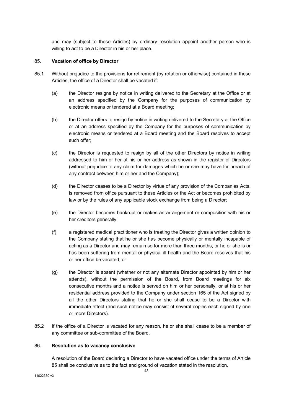 11022380 v3 43 and may (subject to these Articles) by ordinary resolution appoint another person who is willing to act to be a Director in his or her place. 85. Vacation of office by Director 85.1 Without prejudice to the provisions for retirement (by rotation or otherwise) contained in these Articles, the office of a Director shall be vacated if: (a) the Director resigns by notice in writing delivered to the Secretary at the Office or at an address specified by the Company for the purposes of communication by electronic means or tendered at a Board meeting; (b) the Director offers to resign by notice in writing delivered to the Secretary at the Office or at an address specified by the Company for the purposes of communication by electronic means or tendered at a Board meeting and the Board resolves to accept such offer; (c) the Director is requested to resign by all of the other Directors by notice in writing addressed to him or her at his or her address as shown in the register of Directors (without prejudice to any claim for damages which he or she may have for breach of any contract between him or her and the Company); (d) the Director ceases to be a Director by virtue of any provision of the Companies Acts, is removed from office pursuant to these Articles or the Act or becomes prohibited by law or by the rules of any applicable stock exchange from being a Director; (e) the Director becomes bankrupt or makes an arrangement or composition with his or her creditors generally; (f) a registered medical practitioner who is treating the Director gives a written opinion to the Company stating that he or she has become physically or mentally incapable of acting as a Director and may remain so for more than three months, or he or she is or has been suffering from mental or physical ill health and the Board resolves that his or her office be vacated; or (g) the Director is absent (whether or not any alternate Director appointed by him or her attends), without the permission of the Board, from Board meetings for six consecutive months and a notice is served on him or her personally, or at his or her residential address provided to the Company under section 165 of the Act signed by all the other Directors stating that he or she shall cease to be a Director with immediate effect (and such notice may consist of several copies each signed by one or more Directors). 85.2 If the office of a Director is vacated for any reason, he or she shall cease to be a member of any committee or sub-committee of the Board. 86. Resolution as to vacancy conclusive A resolution of the Board declaring a Director to have vacated office under the terms of Article 85 shall be conclusive as to the fact and ground of vacation stated in the resolution.