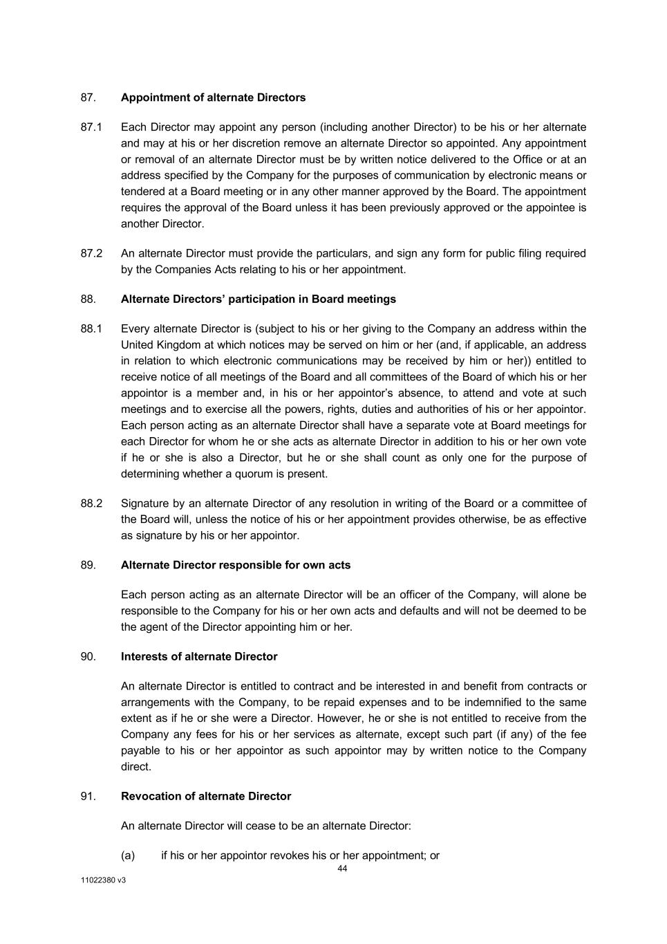 11022380 v3 44 87. Appointment of alternate Directors 87.1 Each Director may appoint any person (including another Director) to be his or her alternate and may at his or her discretion remove an alternate Director so appointed. Any appointment or removal of an alternate Director must be by written notice delivered to the Office or at an address specified by the Company for the purposes of communication by electronic means or tendered at a Board meeting or in any other manner approved by the Board. The appointment requires the approval of the Board unless it has been previously approved or the appointee is another Director. 87.2 An alternate Director must provide the particulars, and sign any form for public filing required by the Companies Acts relating to his or her appointment. 88. Alternate Directors’ participation in Board meetings 88.1 Every alternate Director is (subject to his or her giving to the Company an address within the United Kingdom at which notices may be served on him or her (and, if applicable, an address in relation to which electronic communications may be received by him or her)) entitled to receive notice of all meetings of the Board and all committees of the Board of which his or her appointor is a member and, in his or her appointor’s absence, to attend and vote at such meetings and to exercise all the powers, rights, duties and authorities of his or her appointor. Each person acting as an alternate Director shall have a separate vote at Board meetings for each Director for whom he or she acts as alternate Director in addition to his or her own vote if he or she is also a Director, but he or she shall count as only one for the purpose of determining whether a quorum is present. 88.2 Signature by an alternate Director of any resolution in writing of the Board or a committee of the Board will, unless the notice of his or her appointment provides otherwise, be as effective as signature by his or her appointor. 89. Alternate Director responsible for own acts Each person acting as an alternate Director will be an officer of the Company, will alone be responsible to the Company for his or her own acts and defaults and will not be deemed to be the agent of the Director appointing him or her. 90. Interests of alternate Director An alternate Director is entitled to contract and be interested in and benefit from contracts or arrangements with the Company, to be repaid expenses and to be indemnified to the same extent as if he or she were a Director. However, he or she is not entitled to receive from the Company any fees for his or her services as alternate, except such part (if any) of the fee payable to his or her appointor as such appointor may by written notice to the Company direct. 91. Revocation of alternate Director An alternate Director will cease to be an alternate Director: (a) if his or her appointor revokes his or her appointment; or