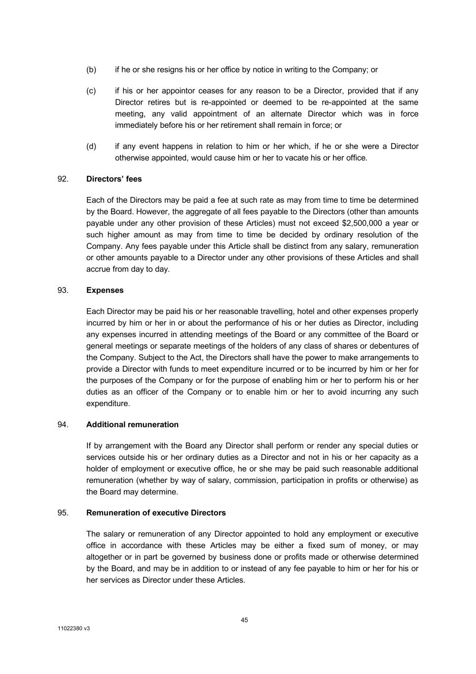 11022380 v3 45 (b) if he or she resigns his or her office by notice in writing to the Company; or (c) if his or her appointor ceases for any reason to be a Director, provided that if any Director retires but is re-appointed or deemed to be re-appointed at the same meeting, any valid appointment of an alternate Director which was in force immediately before his or her retirement shall remain in force; or (d) if any event happens in relation to him or her which, if he or she were a Director otherwise appointed, would cause him or her to vacate his or her office. 92. Directors’ fees Each of the Directors may be paid a fee at such rate as may from time to time be determined by the Board. However, the aggregate of all fees payable to the Directors (other than amounts payable under any other provision of these Articles) must not exceed $2,500,000 a year or such higher amount as may from time to time be decided by ordinary resolution of the Company. Any fees payable under this Article shall be distinct from any salary, remuneration or other amounts payable to a Director under any other provisions of these Articles and shall accrue from day to day. 93. Expenses Each Director may be paid his or her reasonable travelling, hotel and other expenses properly incurred by him or her in or about the performance of his or her duties as Director, including any expenses incurred in attending meetings of the Board or any committee of the Board or general meetings or separate meetings of the holders of any class of shares or debentures of the Company. Subject to the Act, the Directors shall have the power to make arrangements to provide a Director with funds to meet expenditure incurred or to be incurred by him or her for the purposes of the Company or for the purpose of enabling him or her to perform his or her duties as an officer of the Company or to enable him or her to avoid incurring any such expenditure. 94. Additional remuneration If by arrangement with the Board any Director shall perform or render any special duties or services outside his or her ordinary duties as a Director and not in his or her capacity as a holder of employment or executive office, he or she may be paid such reasonable additional remuneration (whether by way of salary, commission, participation in profits or otherwise) as the Board may determine. 95. Remuneration of executive Directors The salary or remuneration of any Director appointed to hold any employment or executive office in accordance with these Articles may be either a fixed sum of money, or may altogether or in part be governed by business done or profits made or otherwise determined by the Board, and may be in addition to or instead of any fee payable to him or her for his or her services as Director under these Articles.